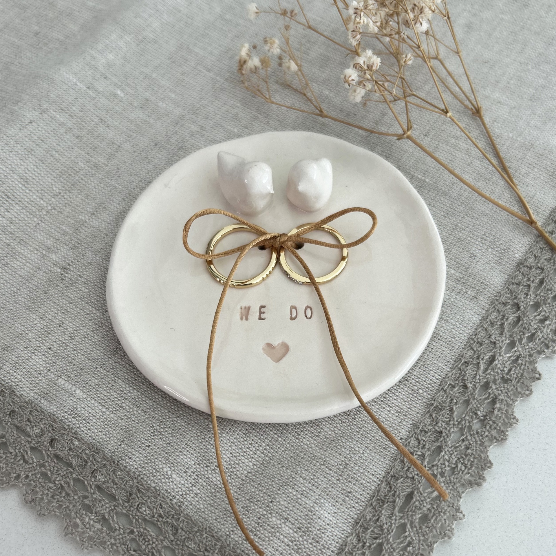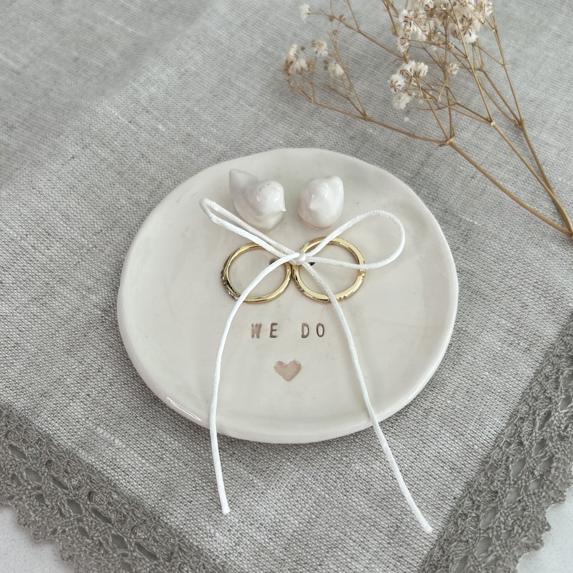 • Prato cerâmico branco com figuras de pássaros, laço dourado e texto, sobre tecido cinza e flores secas