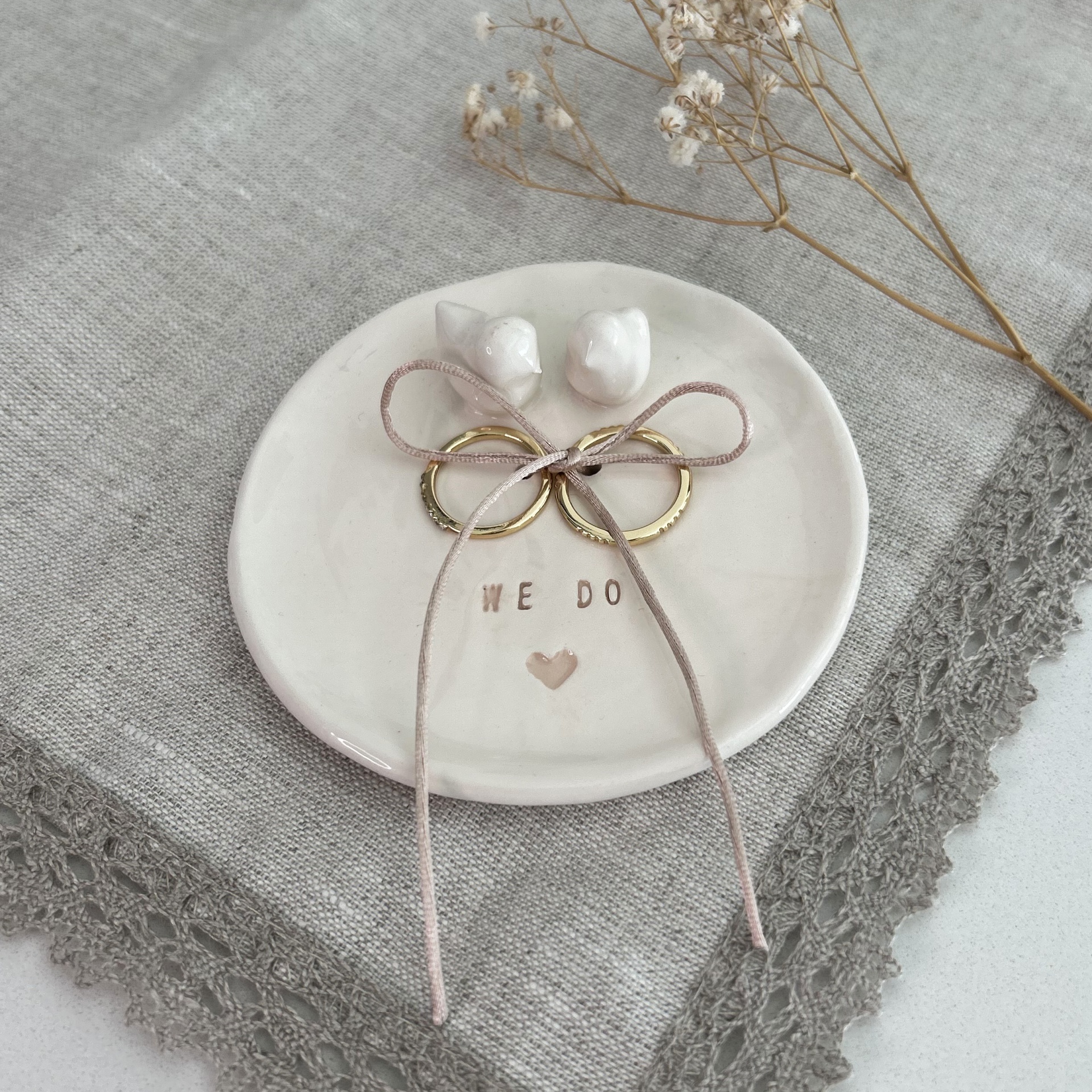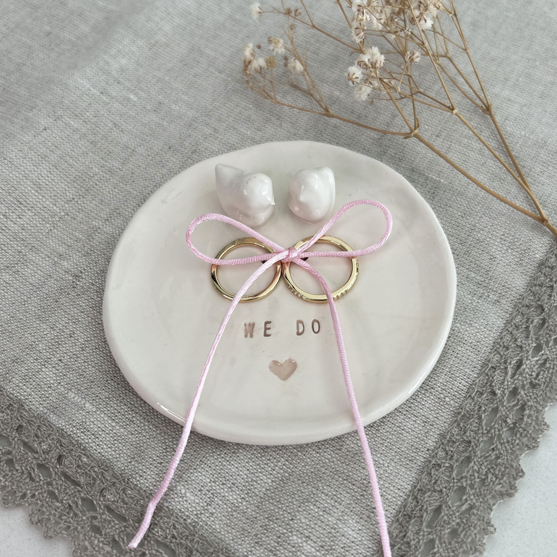 • Prato de cerâmica branco com anéis dourados e corda cor de rosa com texto 'WE DO'