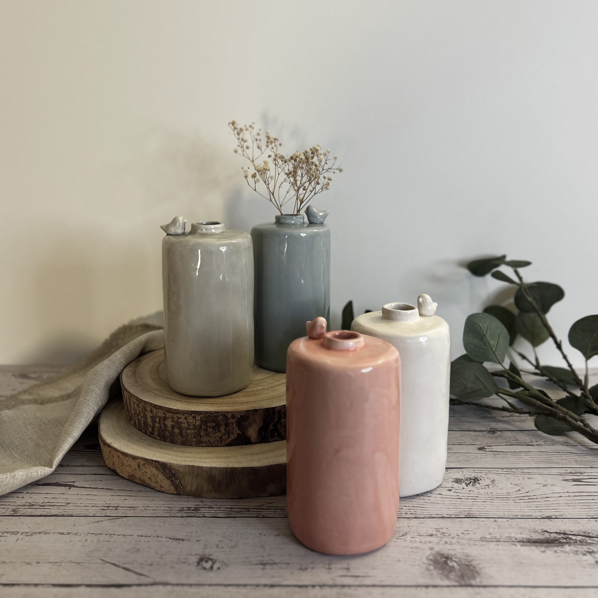 • Quatro vasos cilíndricos de cerâmica com pequenos pássaros no topo, em várias cores, sobre tábuas de madeira em superfície branca envelhecida