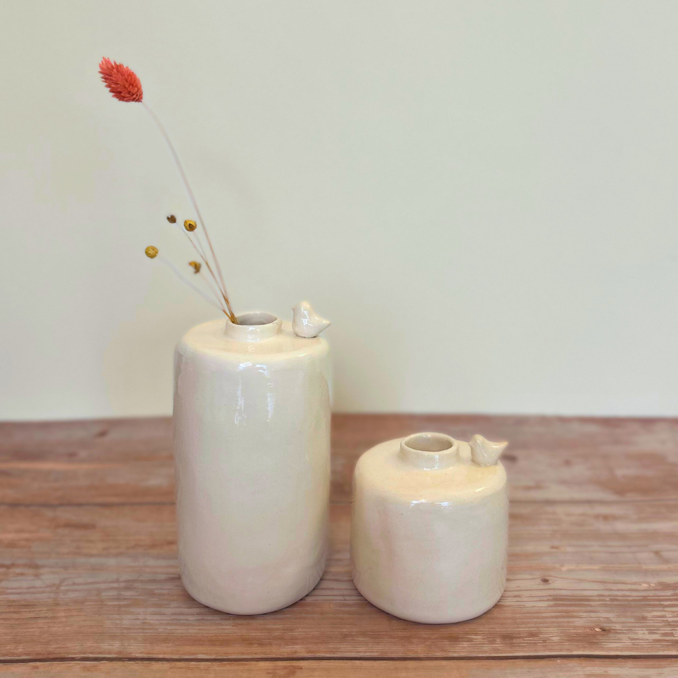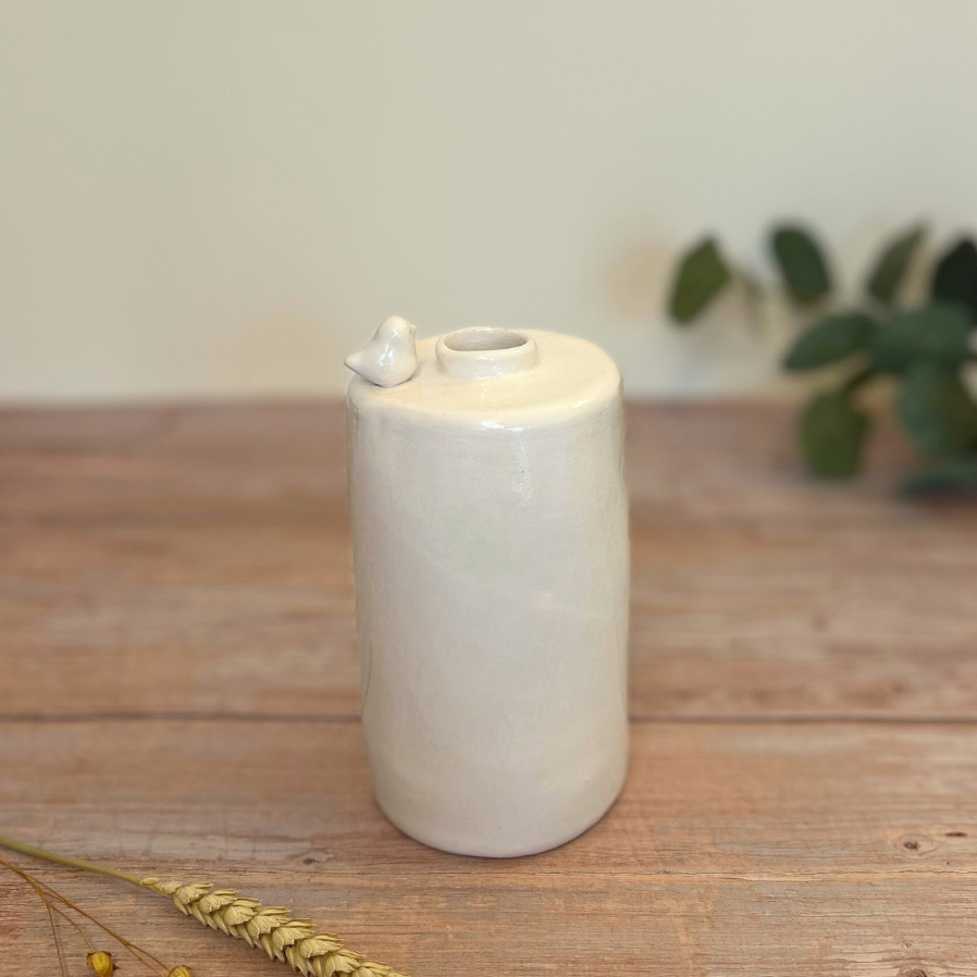• vaso de cerâmica branco cilíndrico com pássaro decorativo