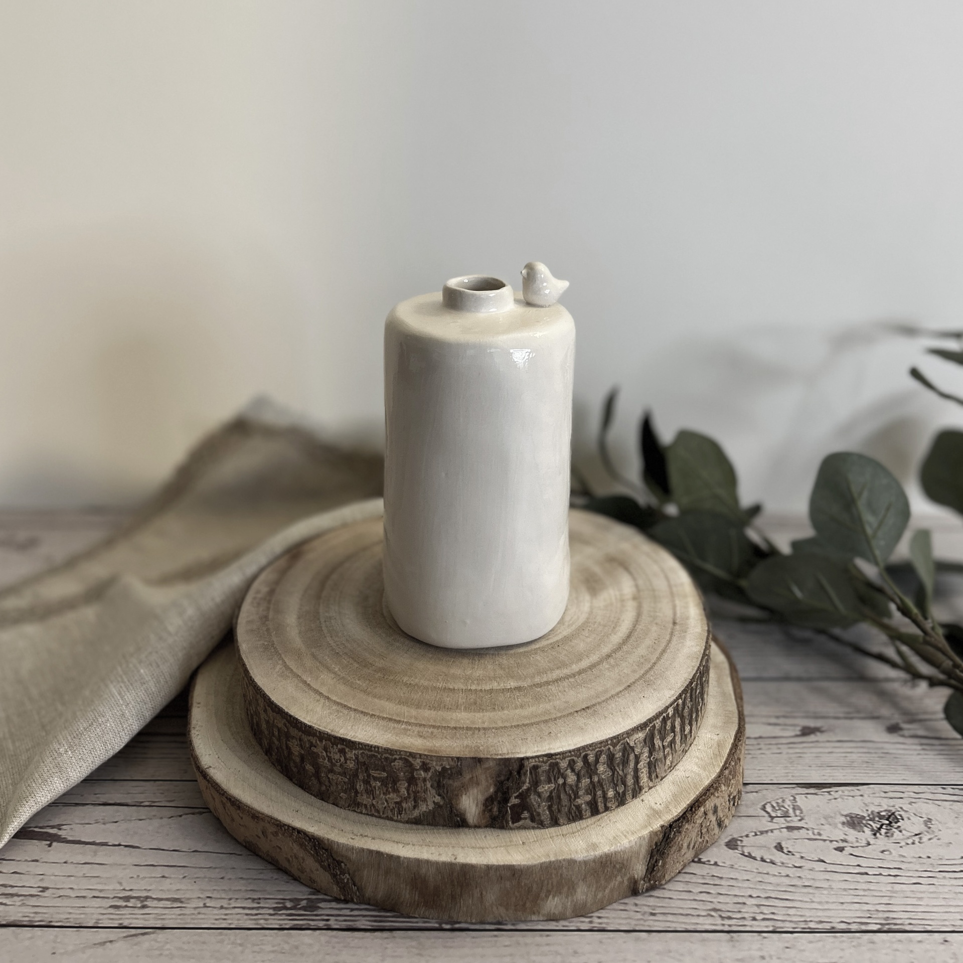 • Vaso cerâmico branco com pequeno pássaro e discos de madeira natural