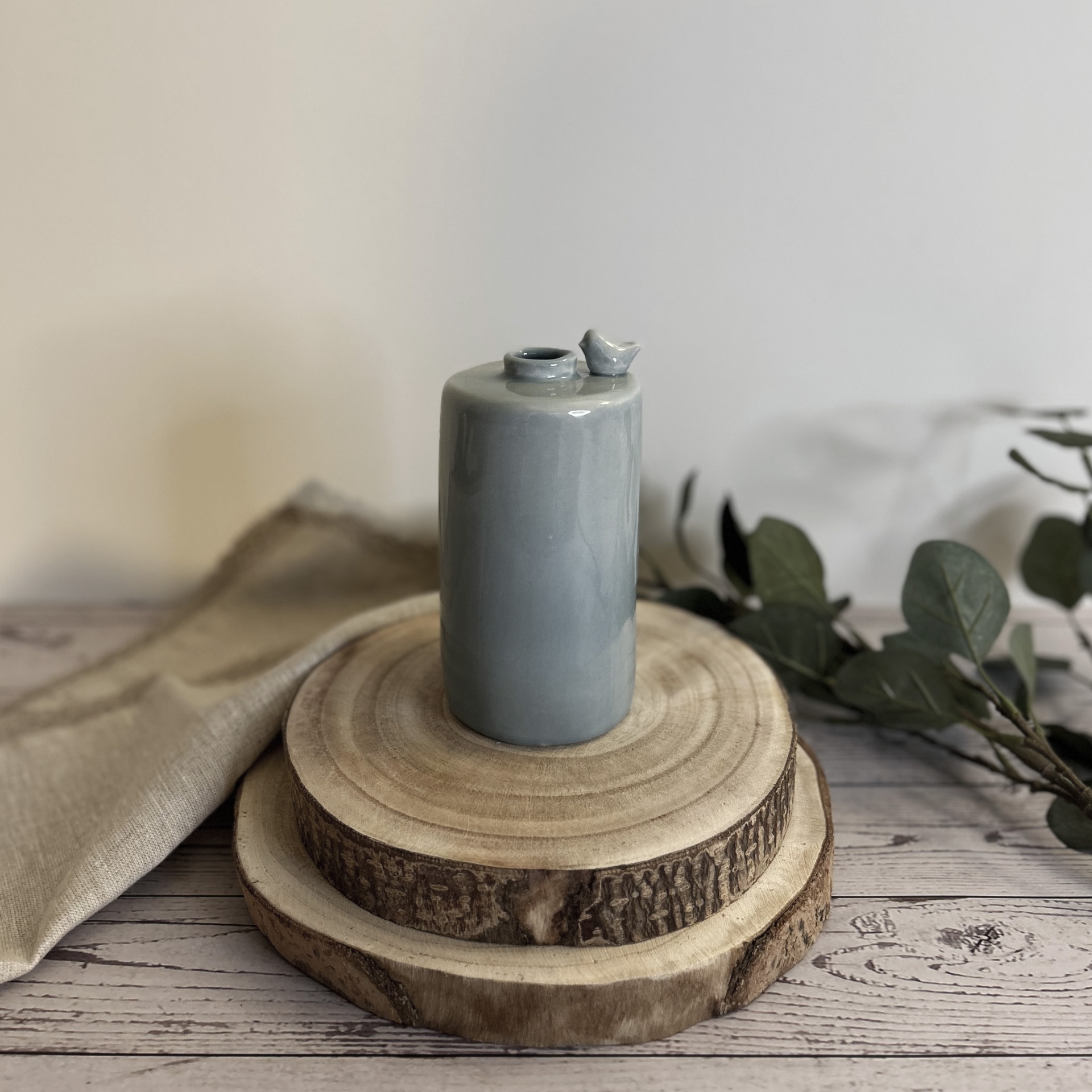 • Frasco de cerâmica cinzento com tampa de pássaro sobre bases de madeira redondas