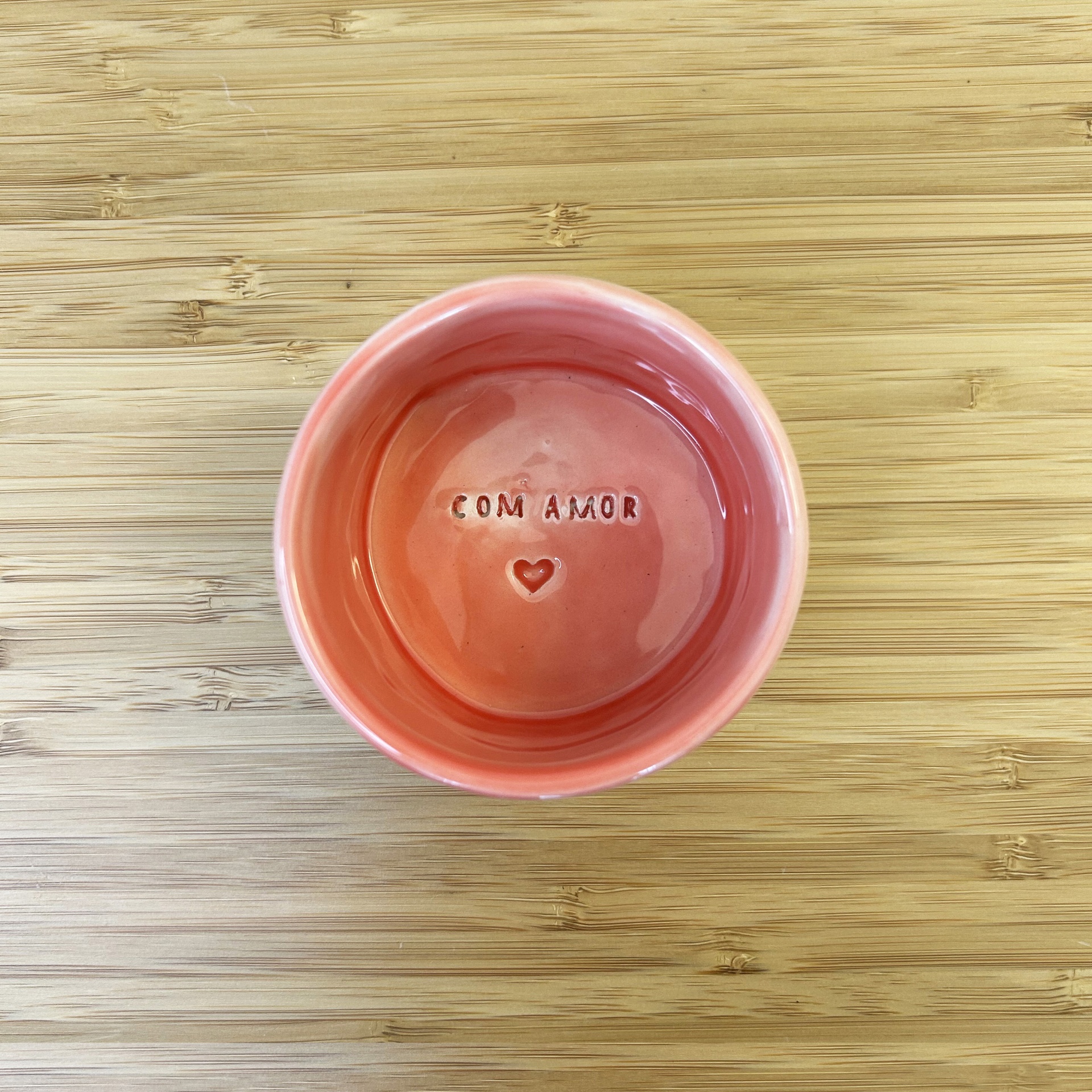 • Taça rosa com texto COM AMOR e coração no interior sobre mesa de madeira