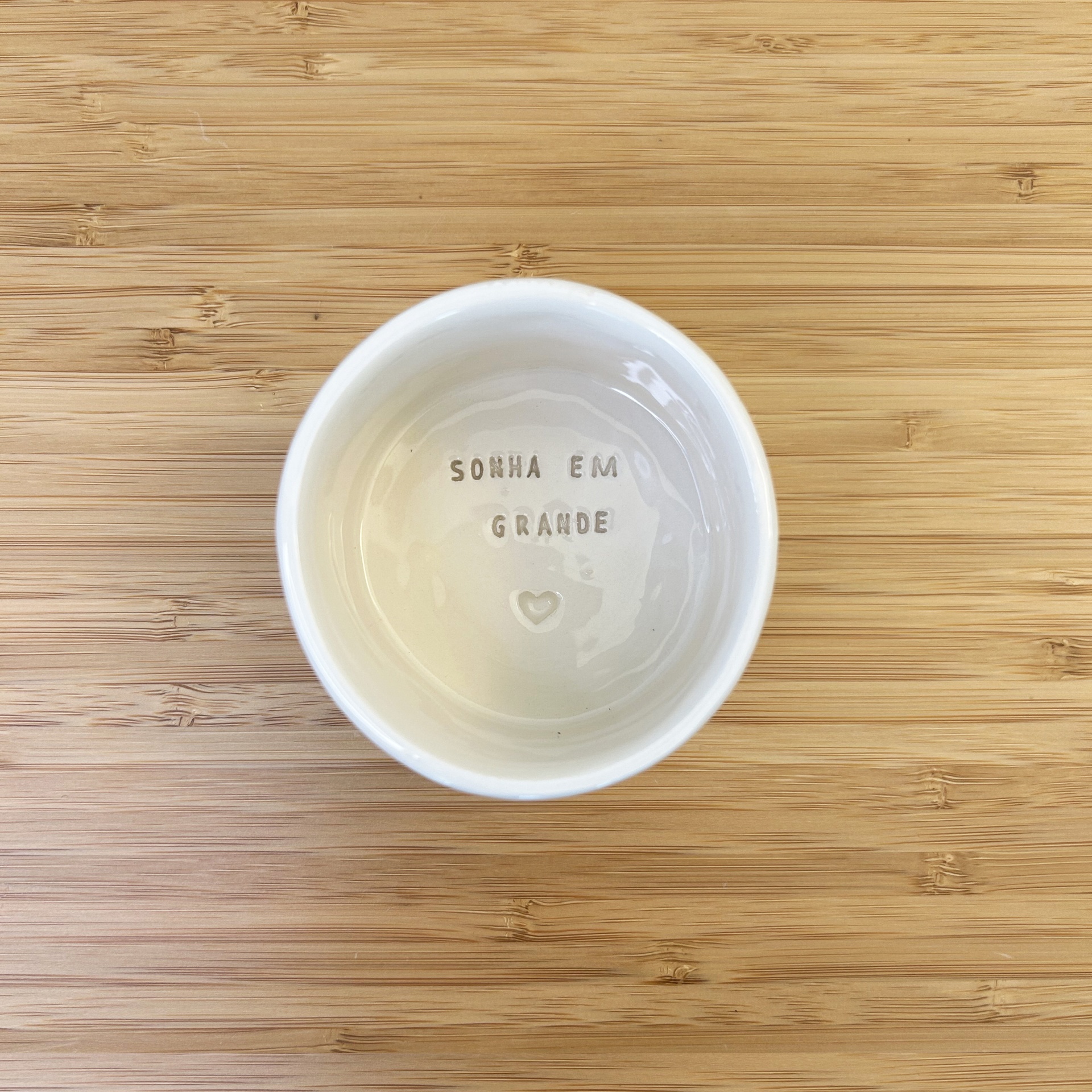 • Taça cerâmica branca com texto 'SONHA EM GRANDE' e coração