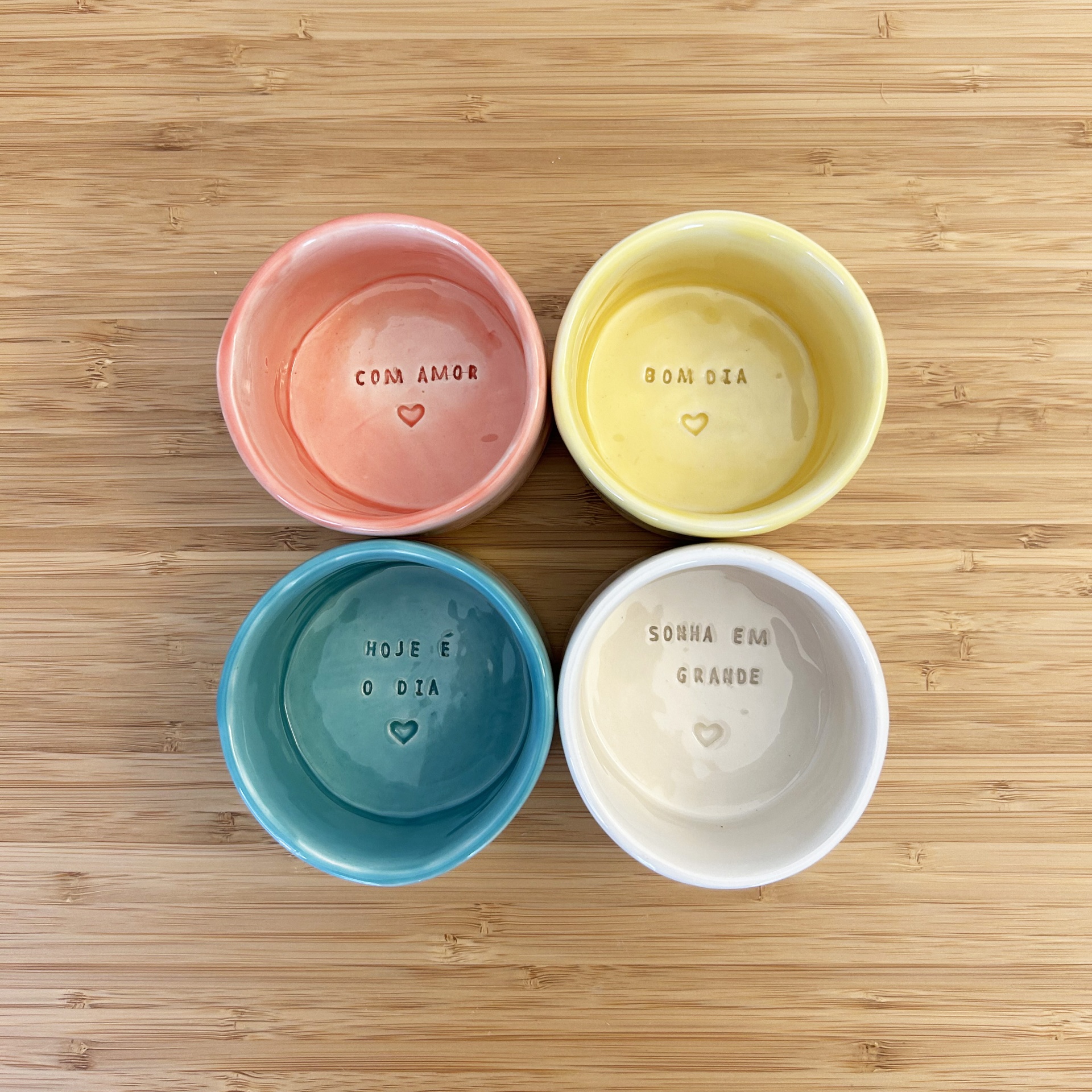 • Quatro tigelas de cerâmica coloridas com frases gravadas dispostas em cima de madeira clara