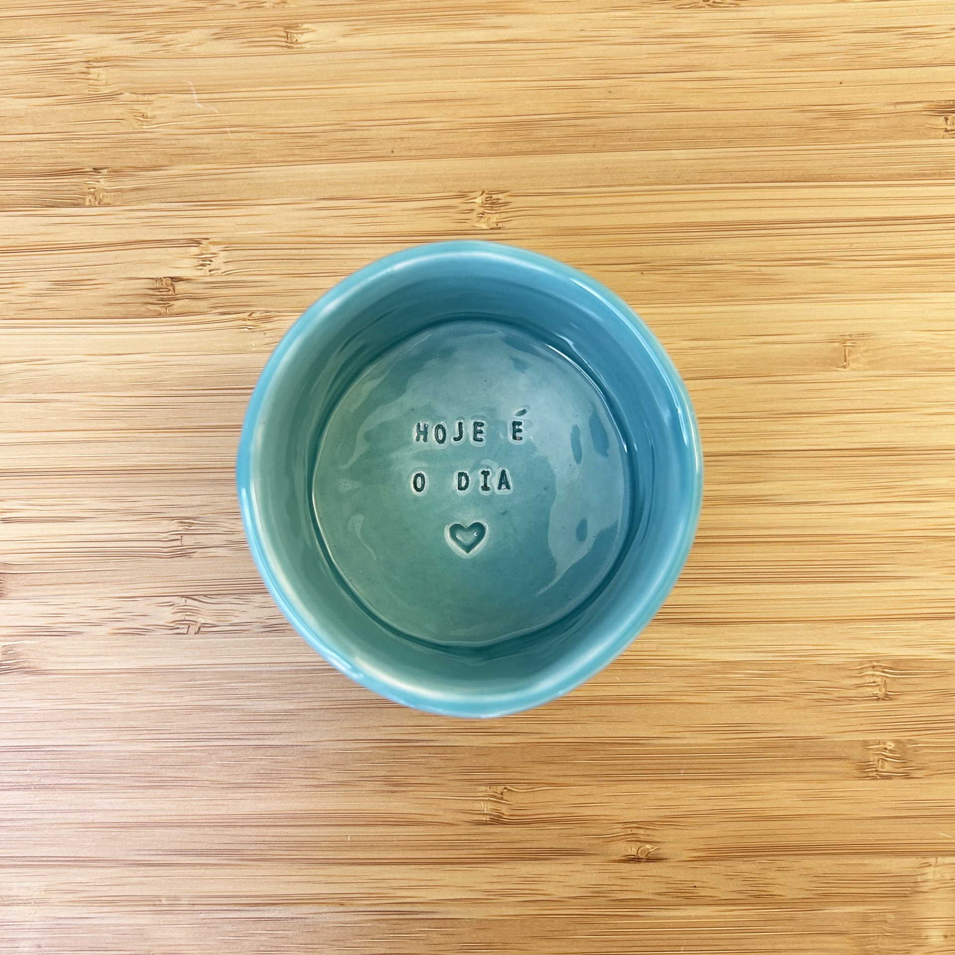 • Taça cerâmica azul com inscrição 'HOJE É O DIA' e coração, sobre superfície de madeira clara