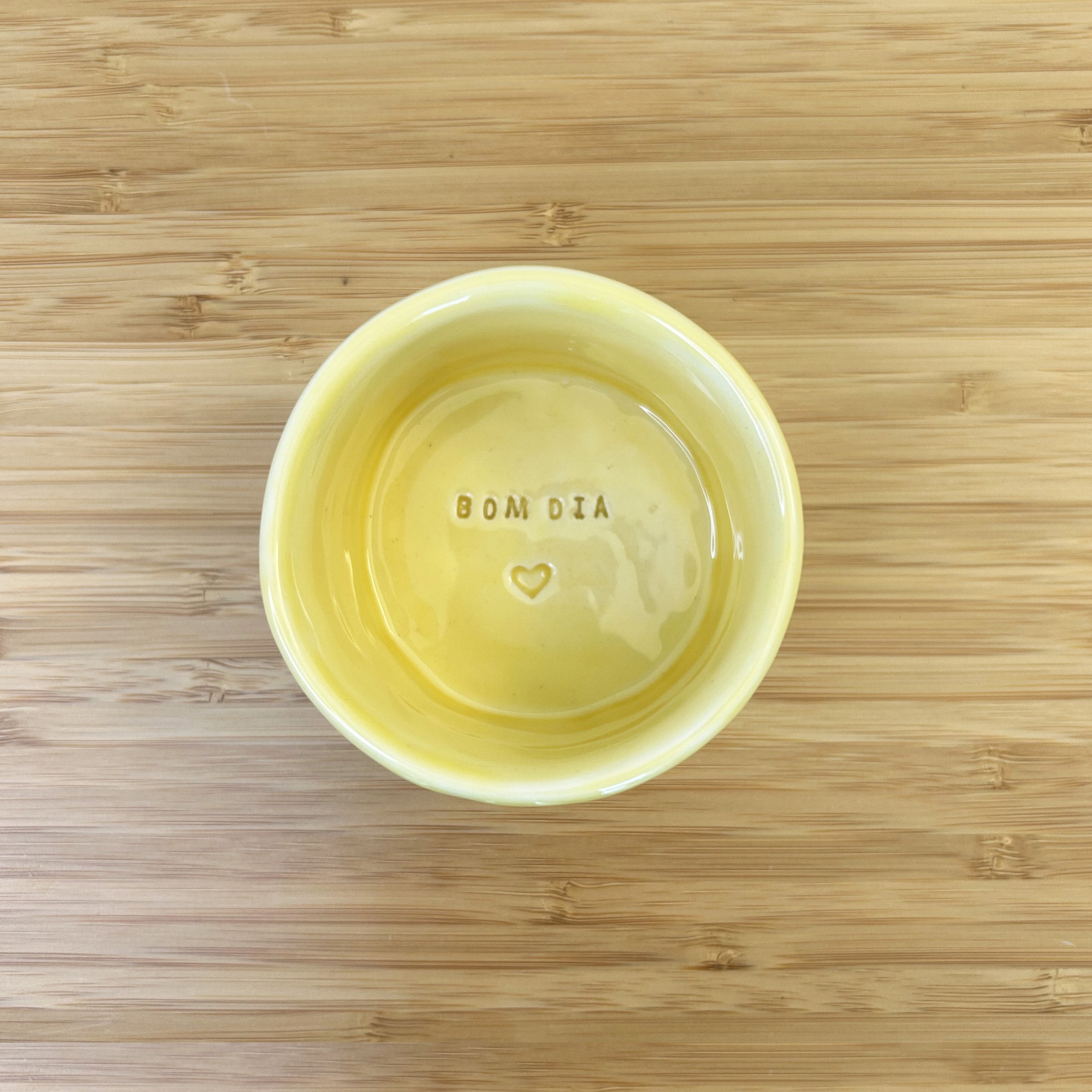 • Tigela cerâmica amarela com inscrição 'BOM DIA' e coração
