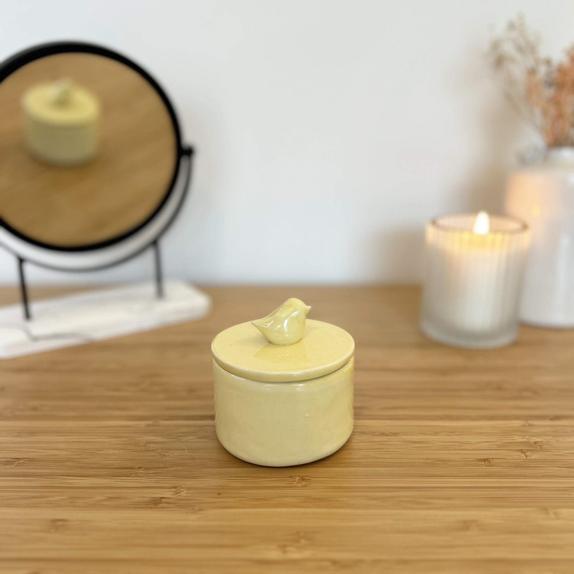 • Caixa redonda amarela em cerâmica com tampa e pássaro decorativo na mesa de madeira