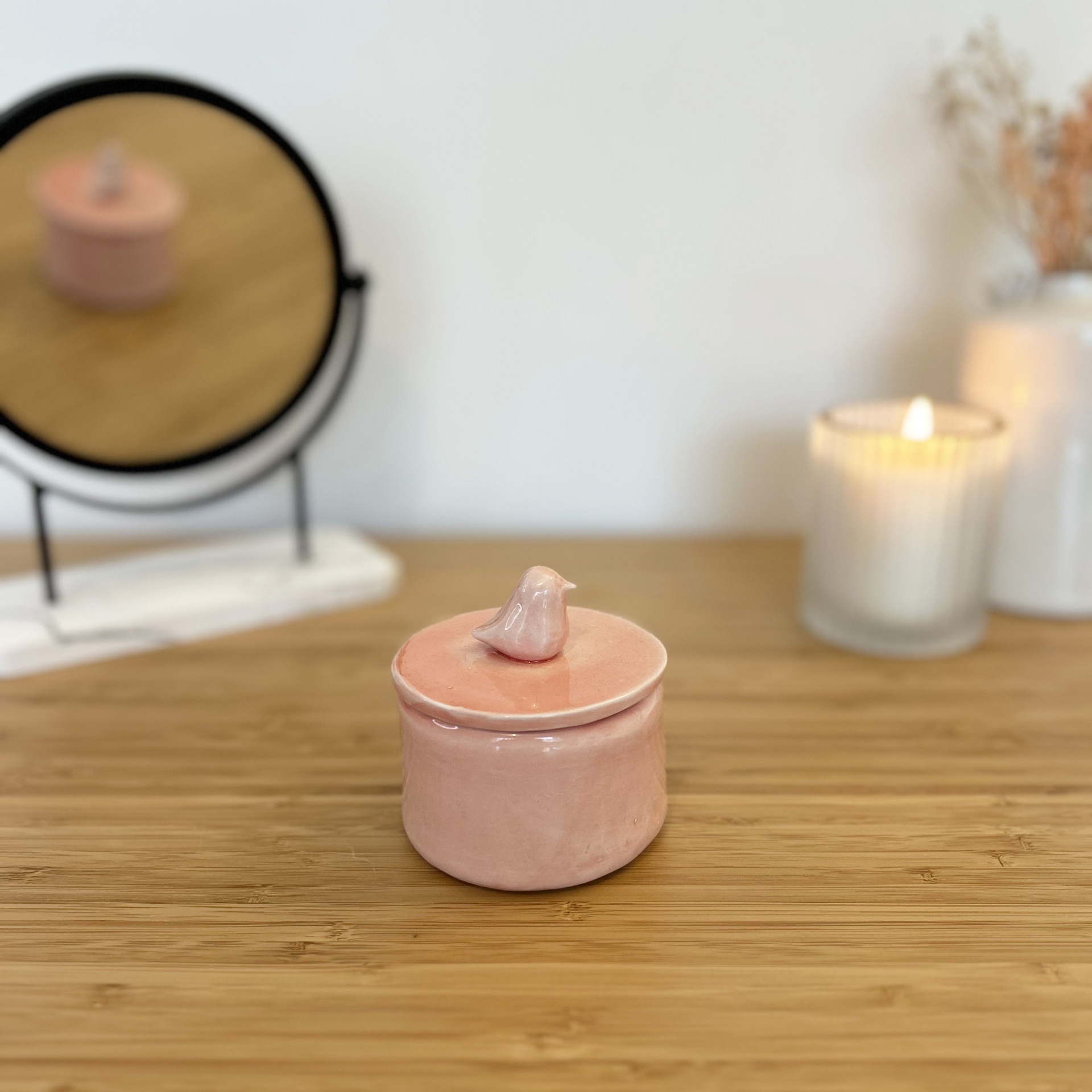 • Caixa cerâmica rosa com tampa e pássaro, sobre mesa de madeira com espelho e vela
