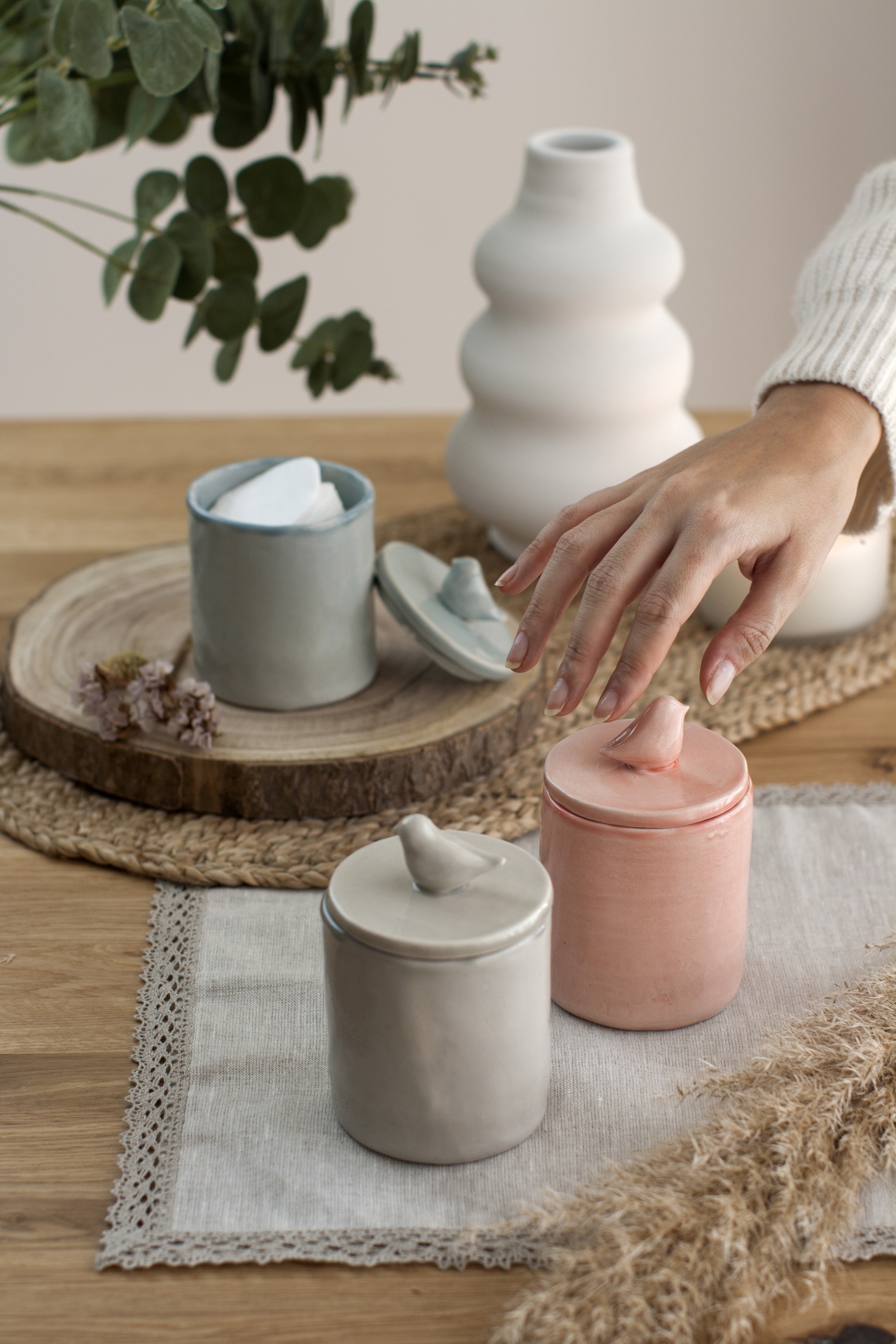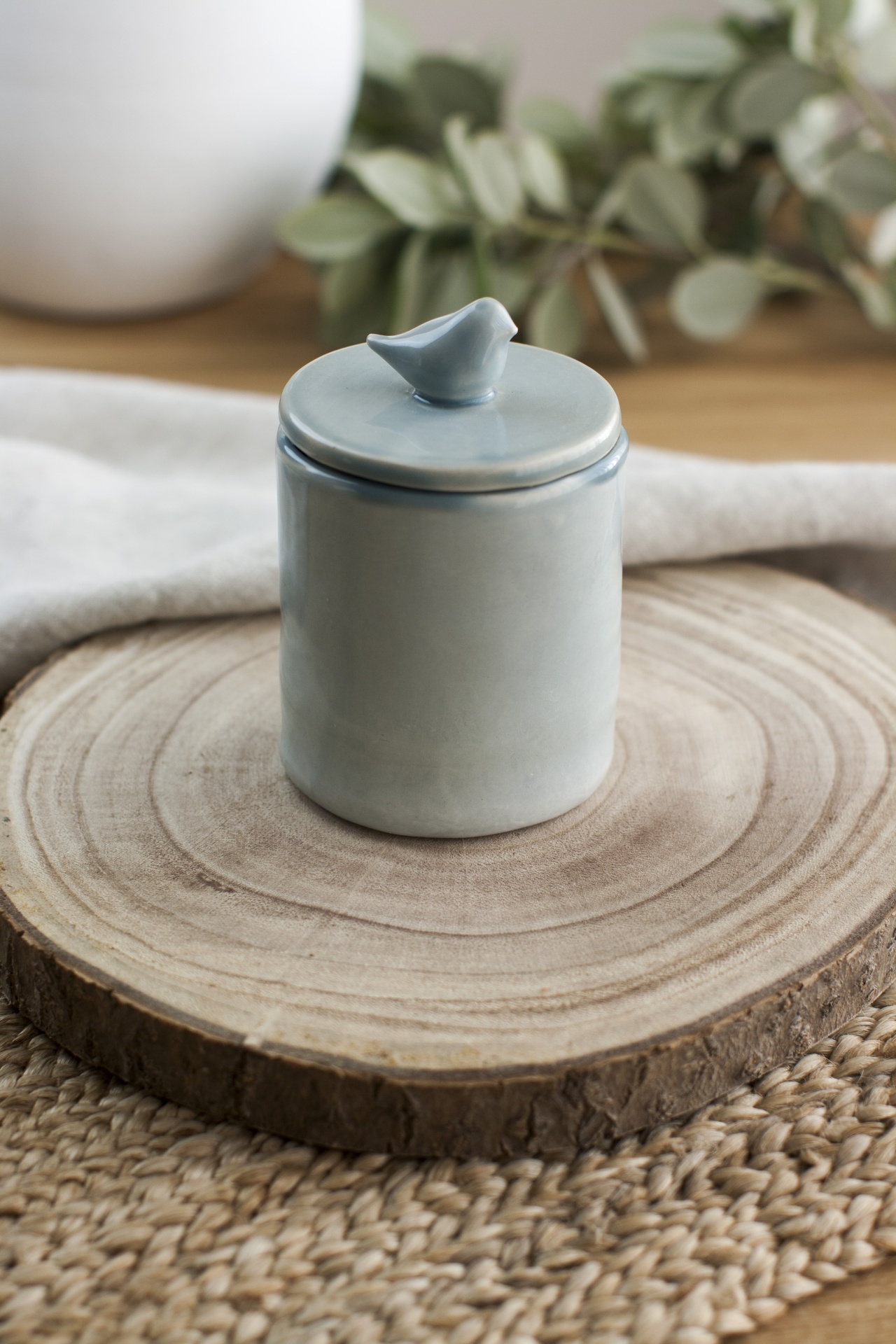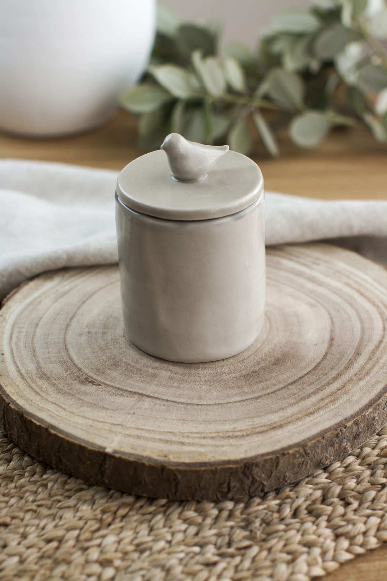 • Pote cerâmico cinza com tampa e pássaro decorativo sobre base de madeira