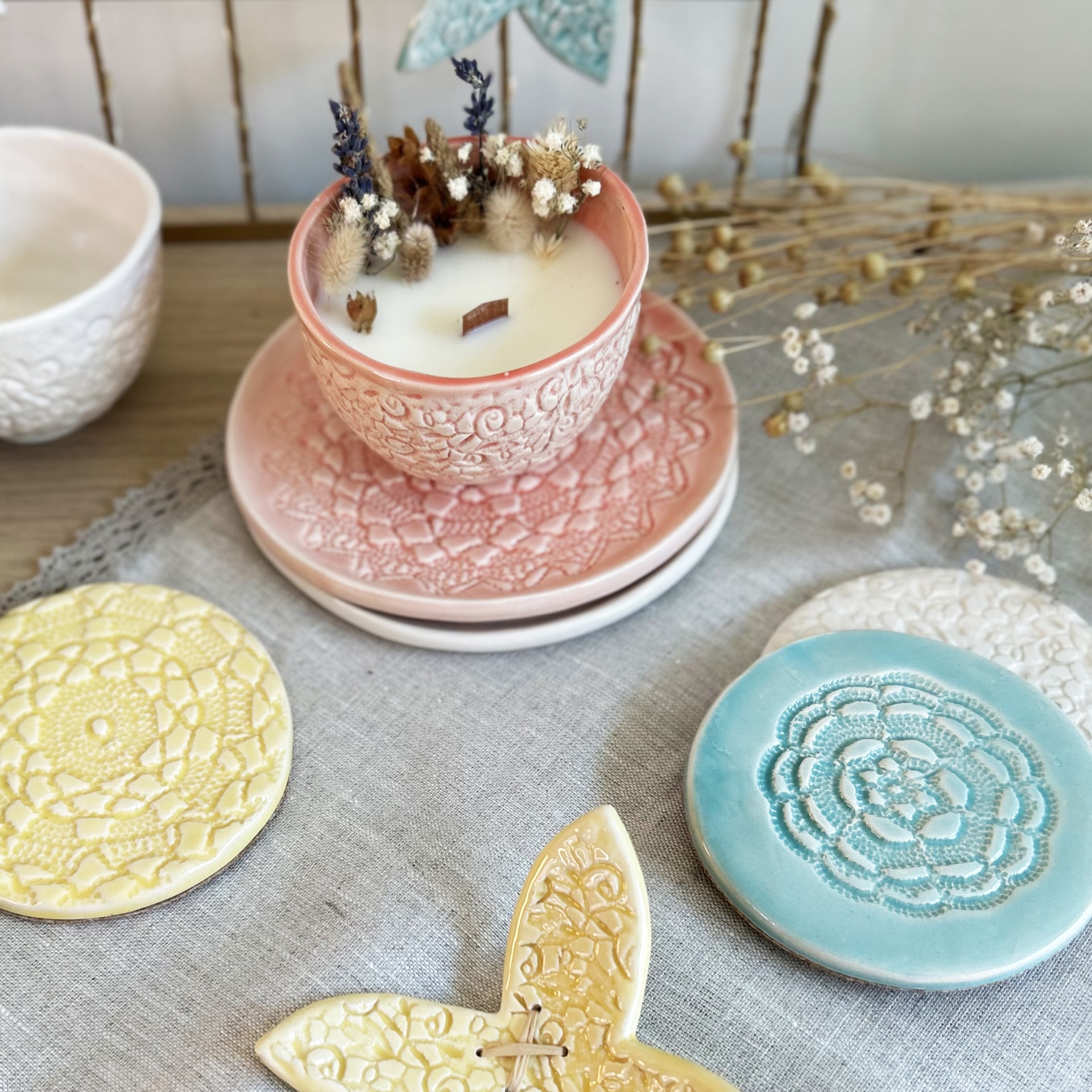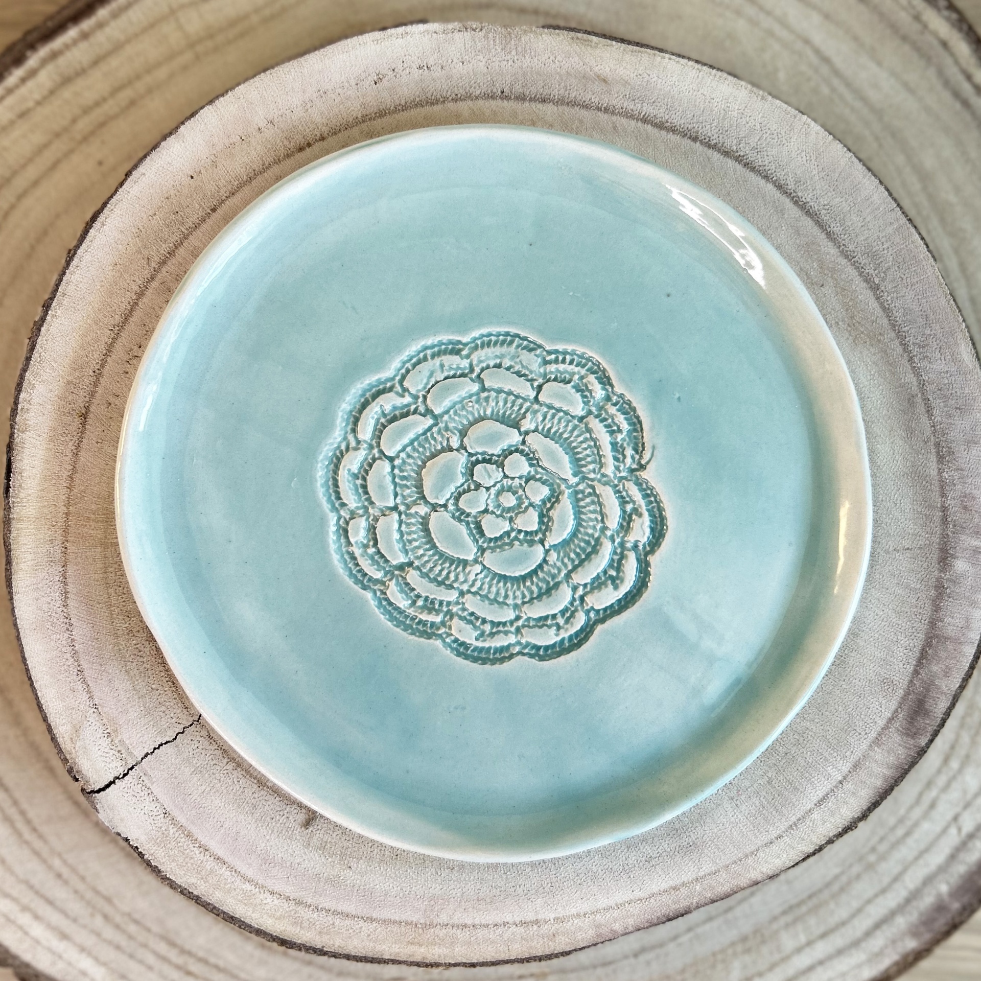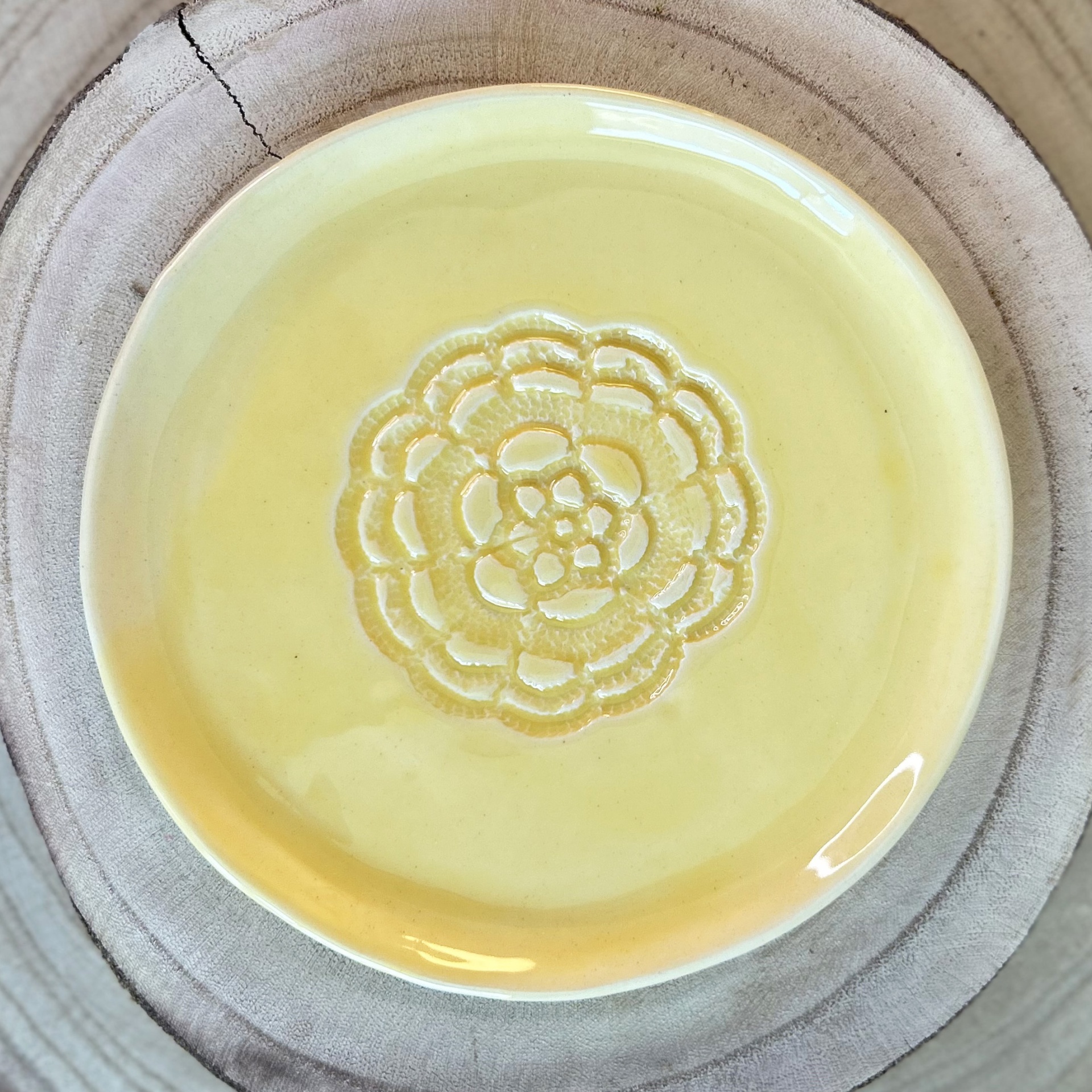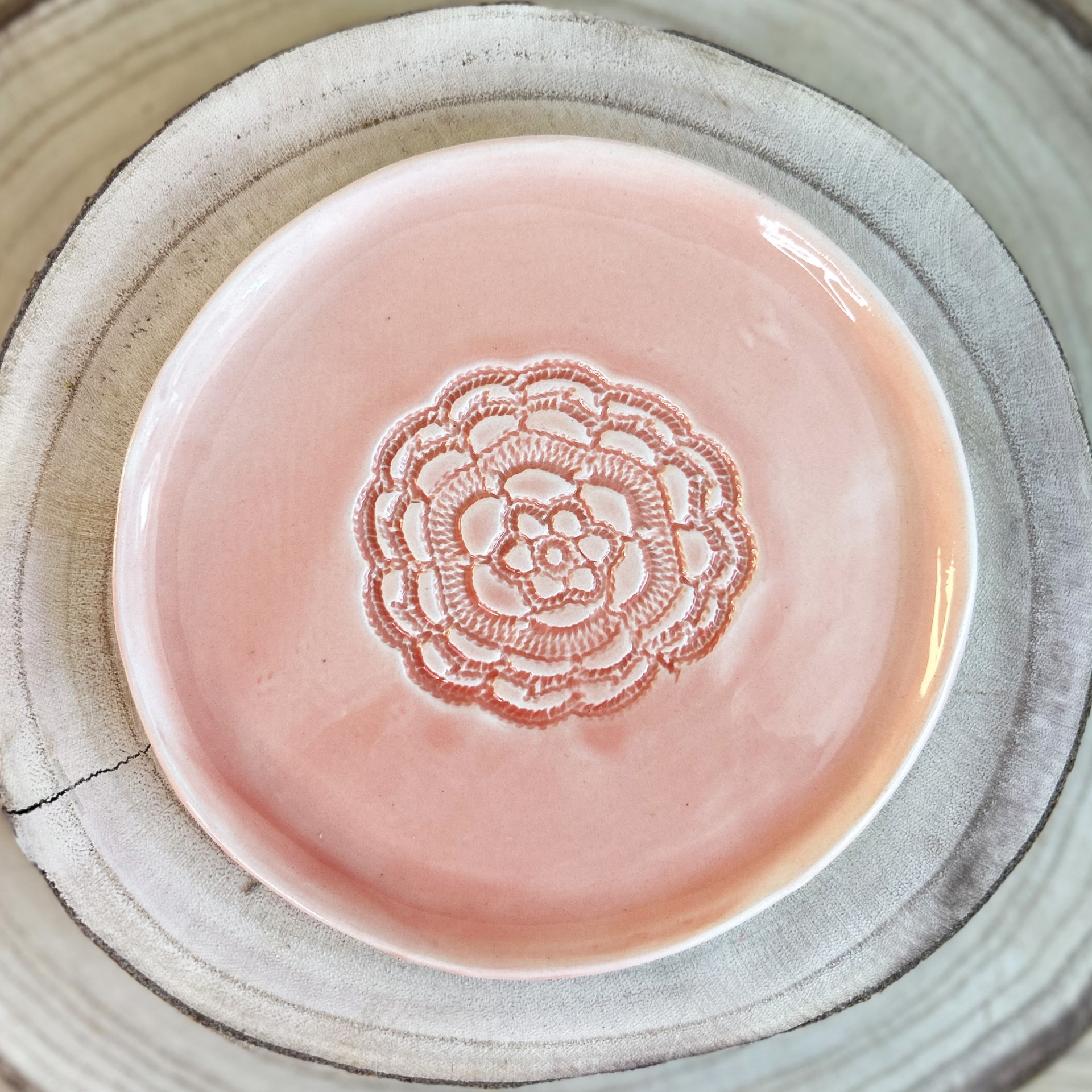 Prato Bordado Flor 10,00 € Desconto de %. Partilhar Cor Branco Menta Coral Amarelo Comprar Contactar SKU: ARTAD0077 Delicado prato com efeito de bordado, ideal para colocar as suas jóias ou pequenos acessórios. Disponível em 4 tons. Diâmetro: 14,5 cm Altura: 1 cm Nota: Peça de artesanato feita à mão, cada peça é única. Recomenda-se que seja lavada à mão. Fabricada em Portugal.