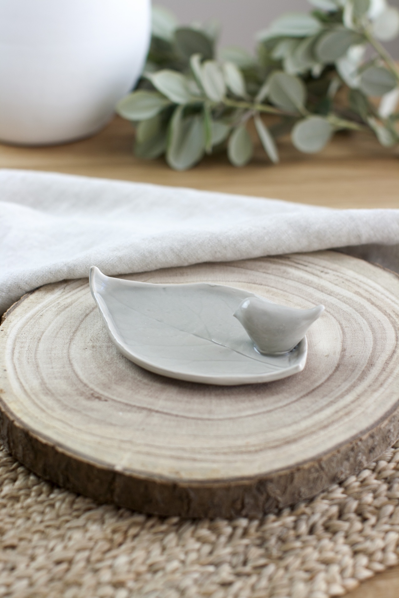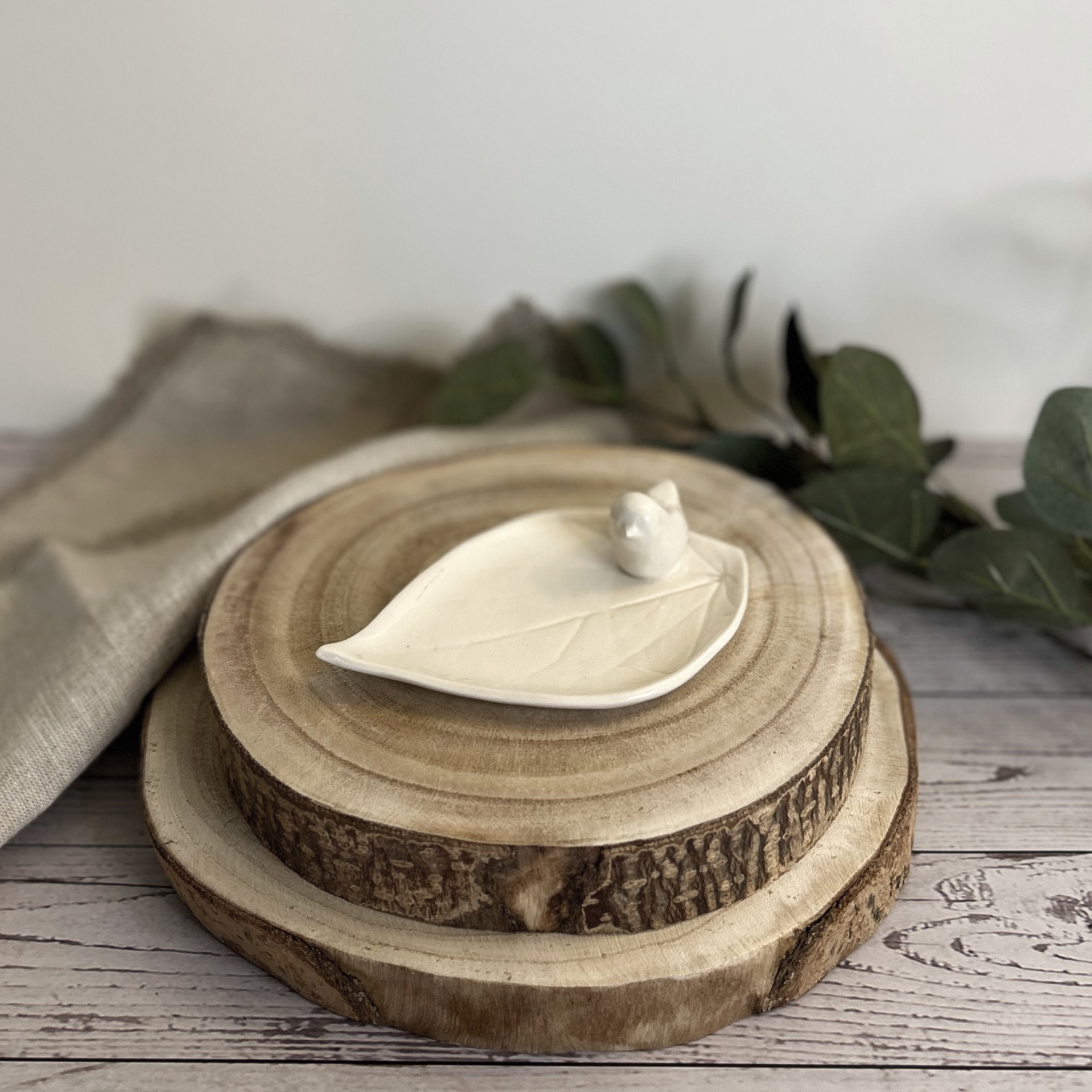 • Prato decorativo cerâmica branca com forma de folha e pássaro, sobre tábua de madeira redonda.