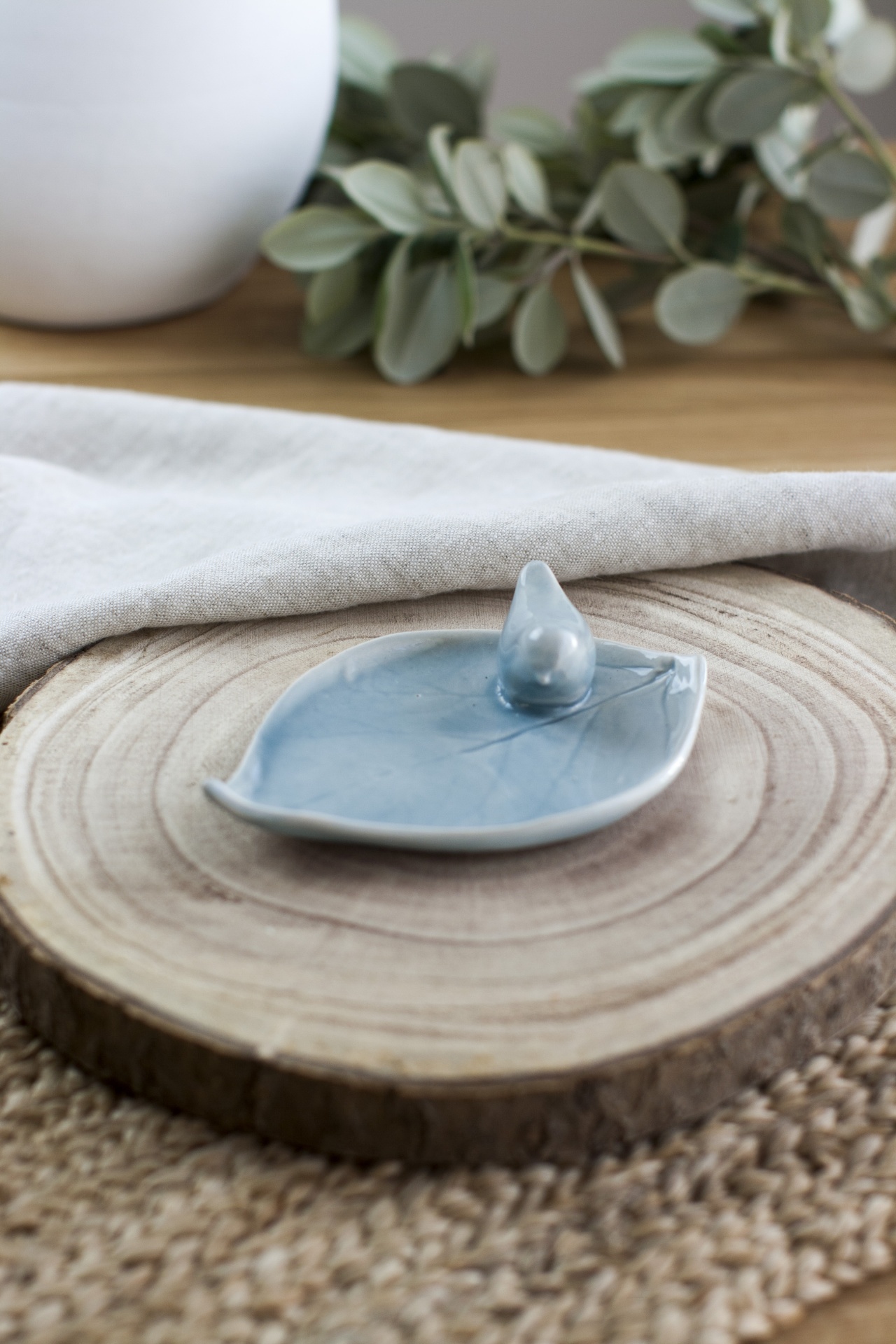 • Prato decorativo azul claro em forma de folha com pássaro em cerâmica sobre corte de tronco de madeira