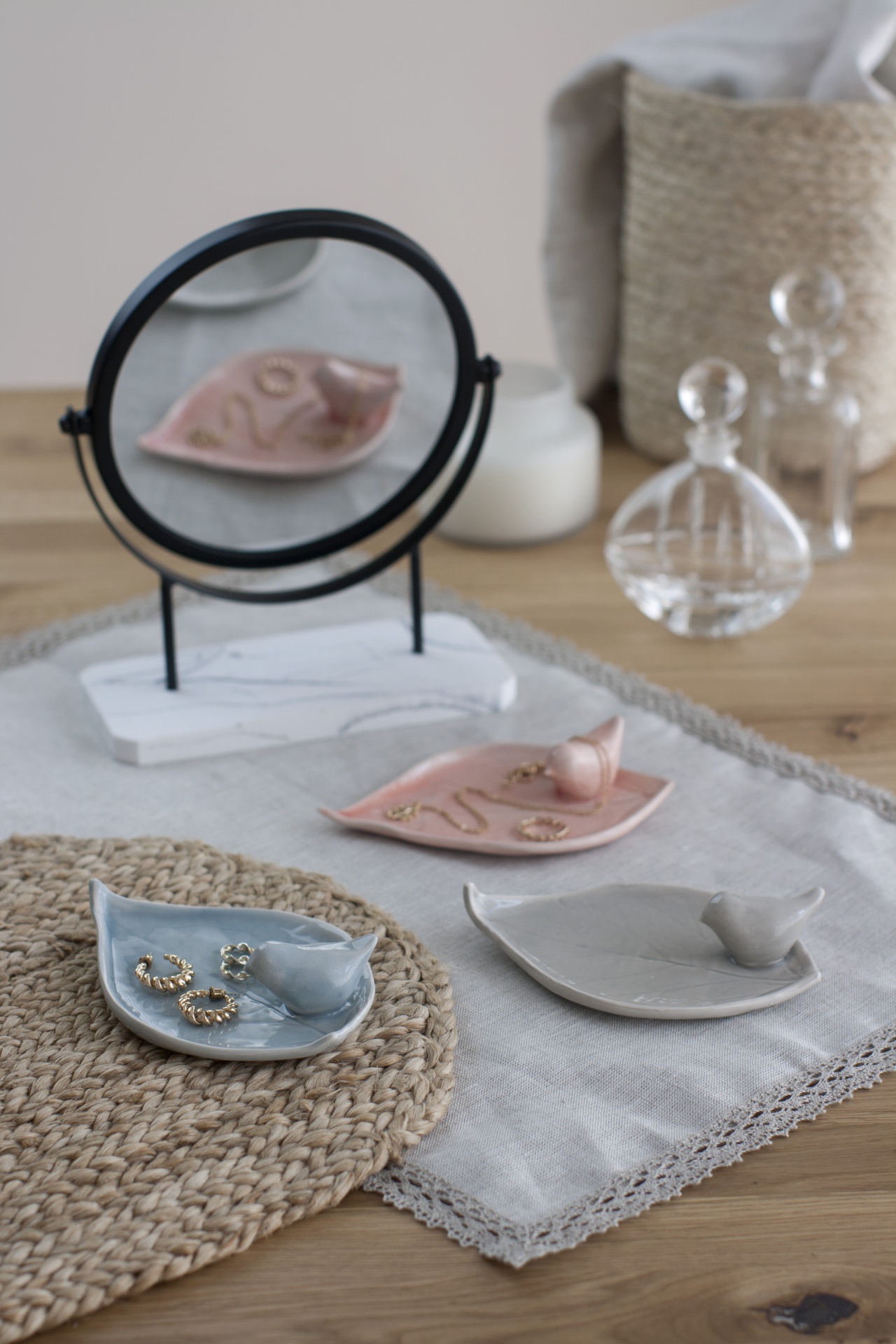 • Três pequenas bandejas de cerâmica em forma de folhas com pássaros decorativos, espelho redondo e frascos de vidro ao fundo numa mesa de madeira