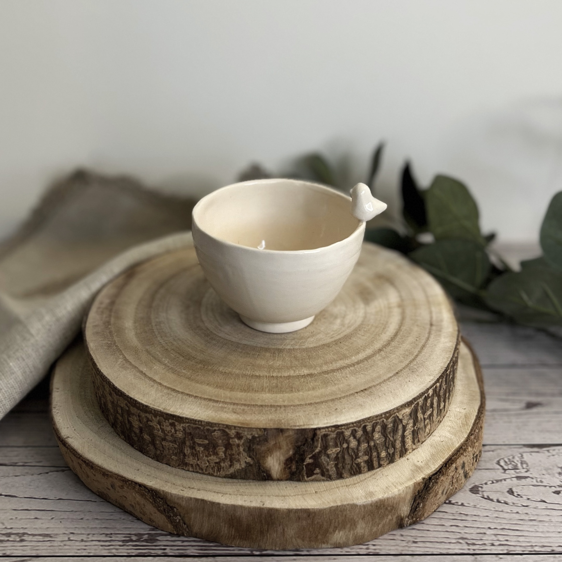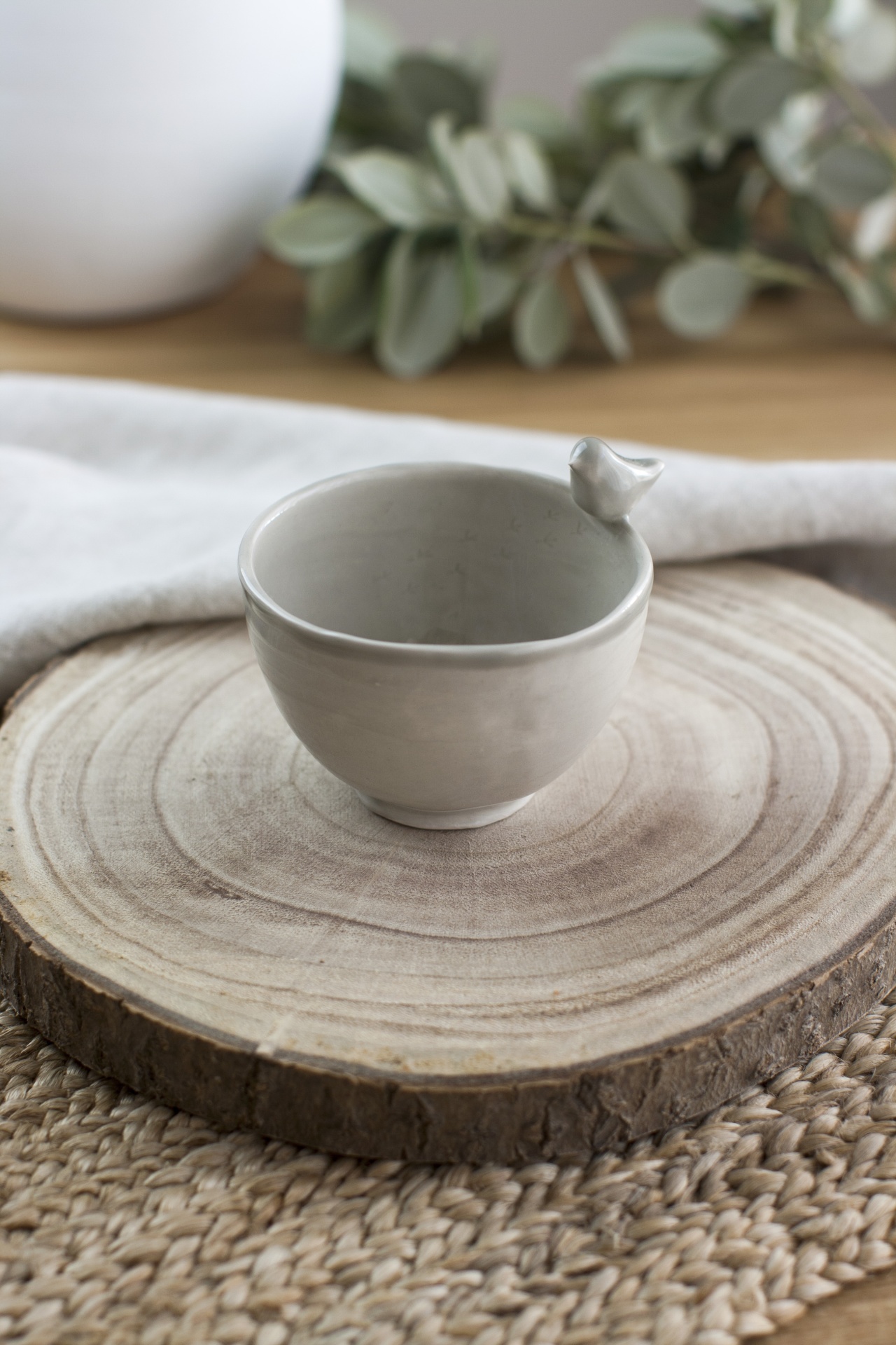 • Chávena cinzenta com pormenor de pássaro sobre disco de madeira
