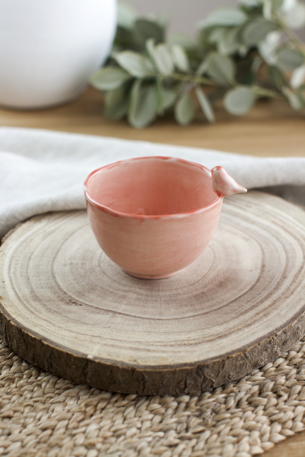 • chávena cor de salmão com bico sobre prato de madeira rústica
