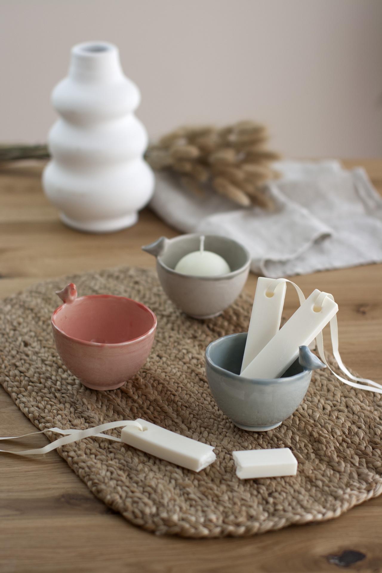 • Três tigelas cerâmicas coloridas com velas e acessórios em mesa de madeira decorativa