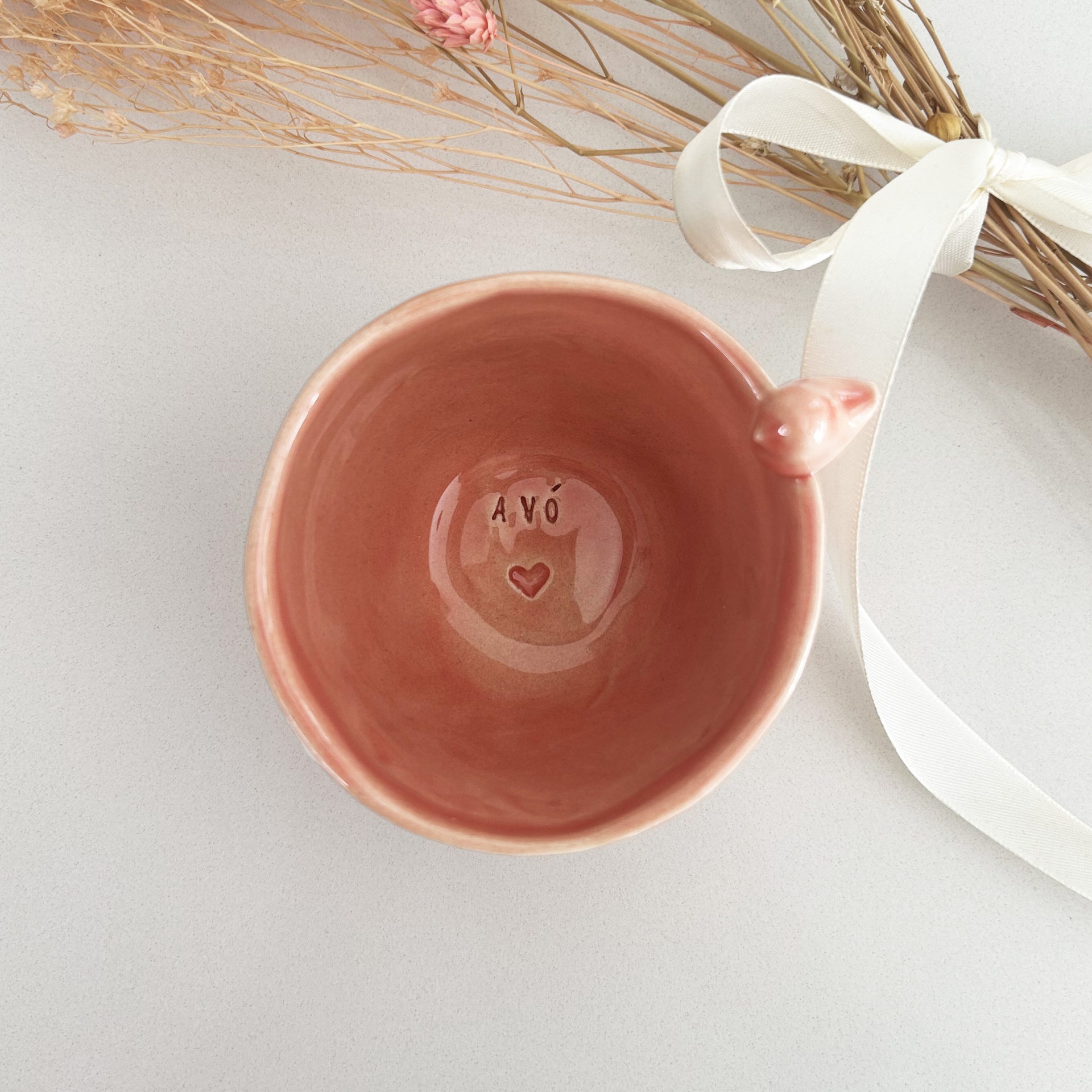 • Caneca rosa de cerâmica com texto AVÓ e coração no interior e raminhos secos com fita branca ao lado
