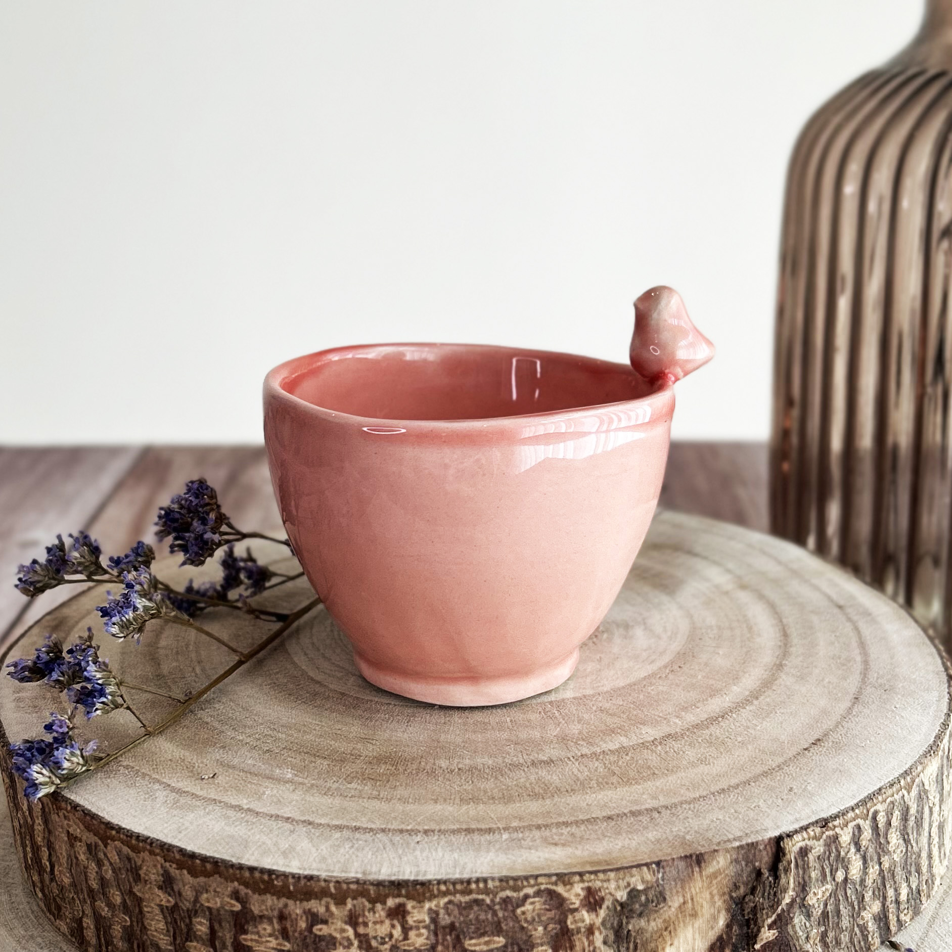 • Chávena cor-de-rosa em cerâmica com pássaro decorativo sobre tronco de madeira
