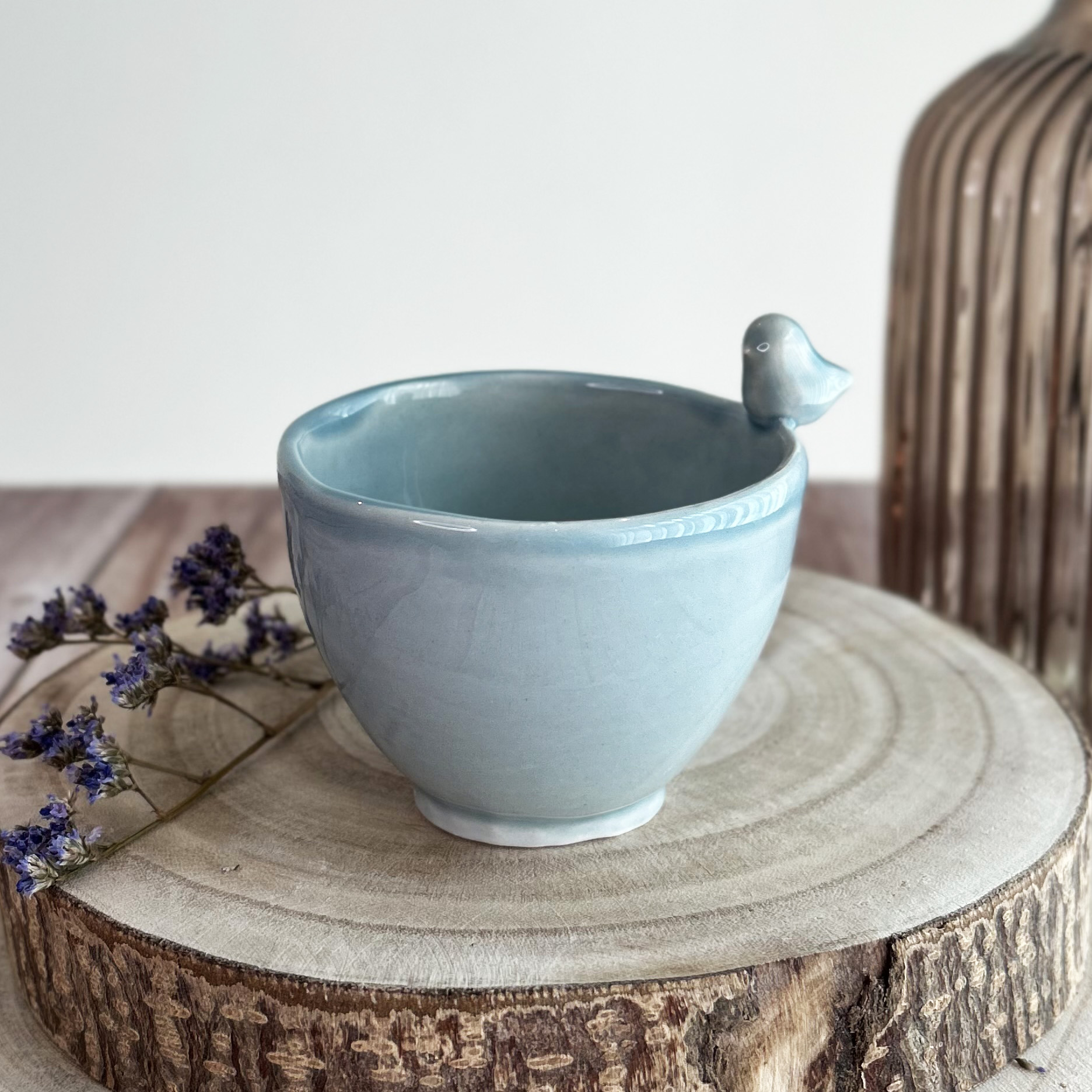 • Caneca azul clara de cerâmica com pássaro decorativo em madeira com flores secas