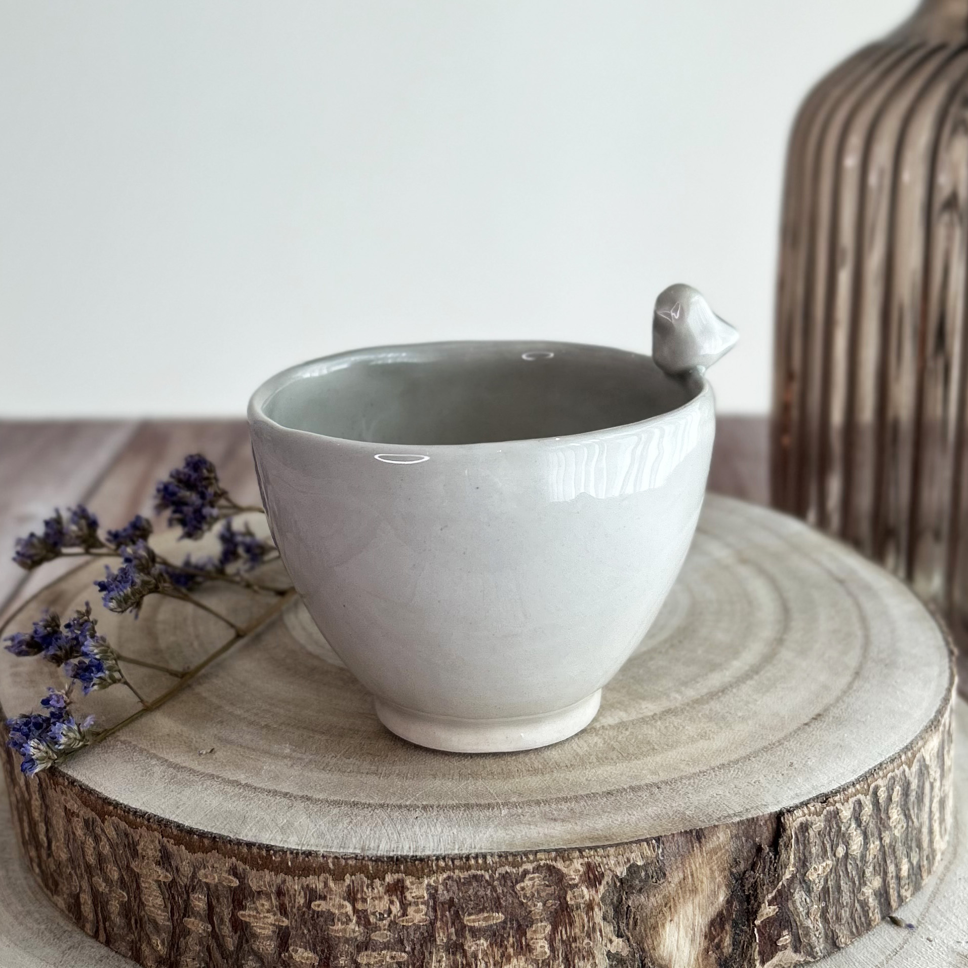• Chávena de cerâmica com pássaro, base de madeira e flores roxas