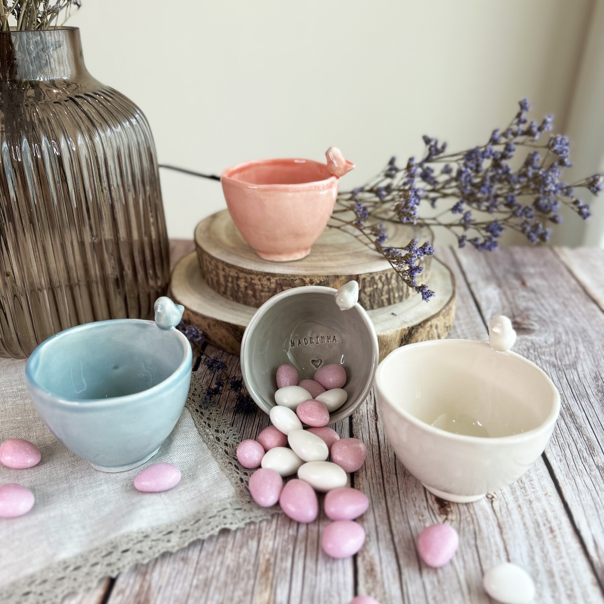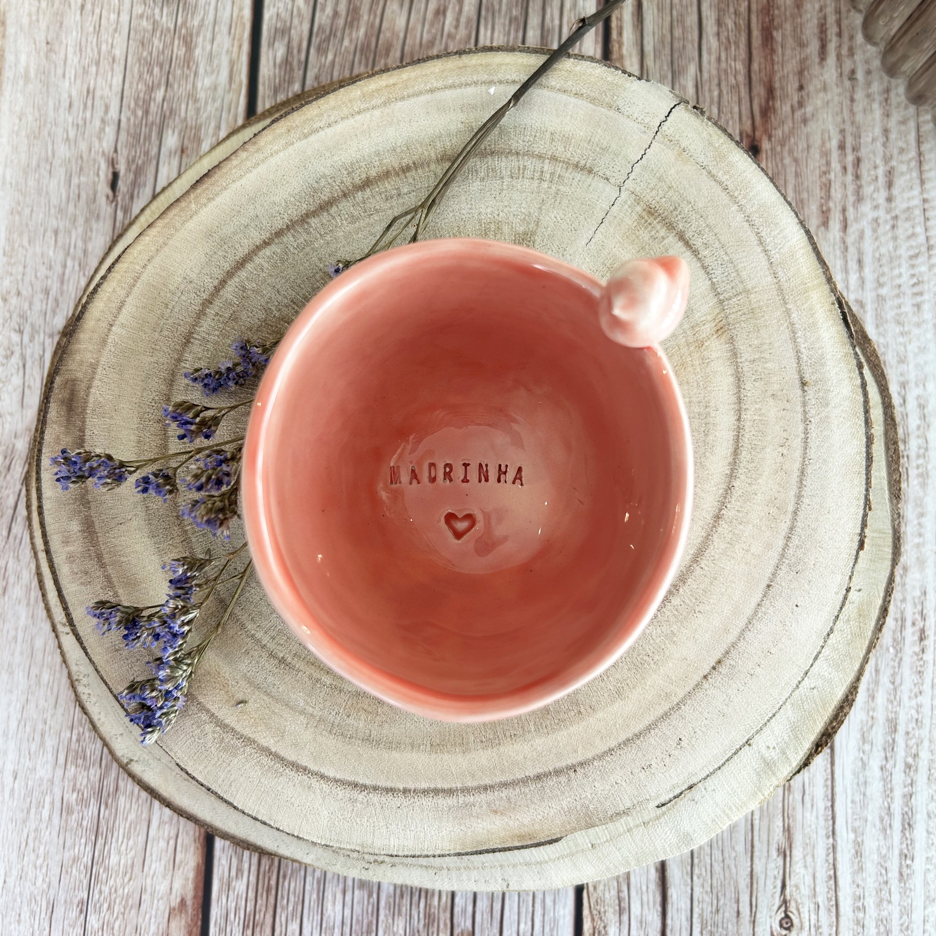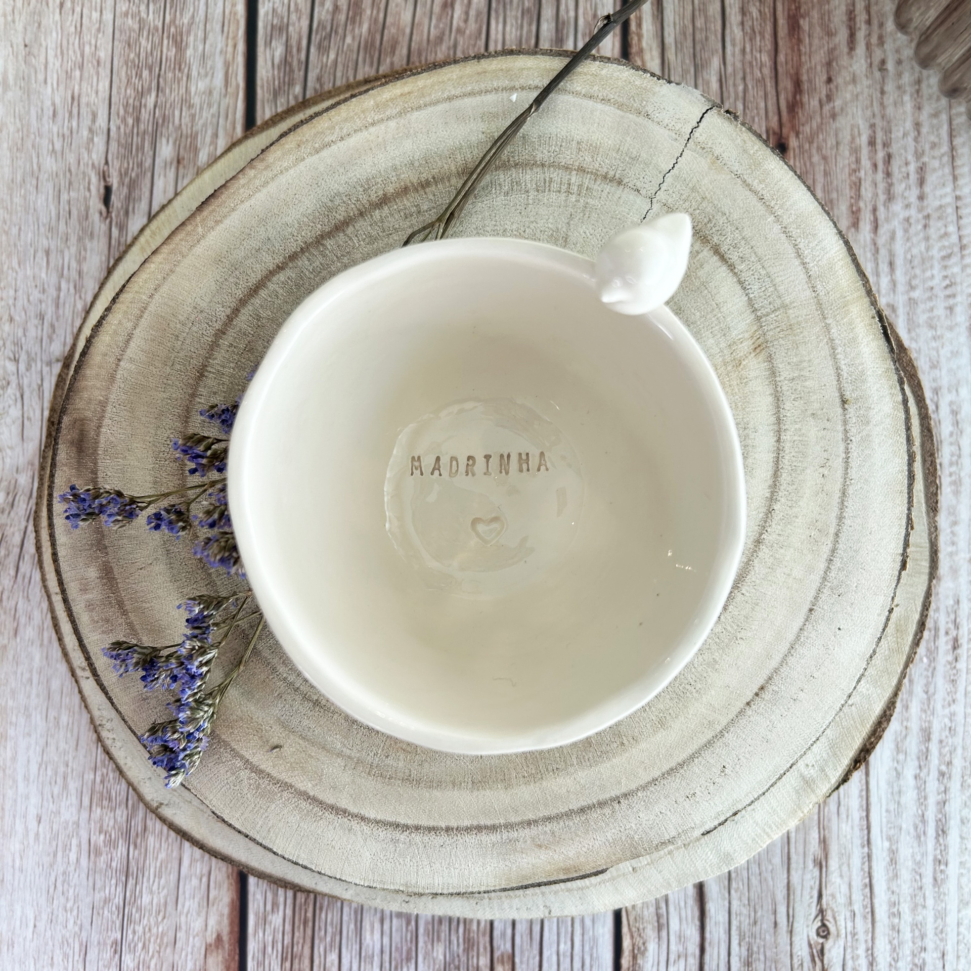 • Taça cerâmica branca com asa em forma de folha e texto MADRINHA, sobre madeira e flores lilás