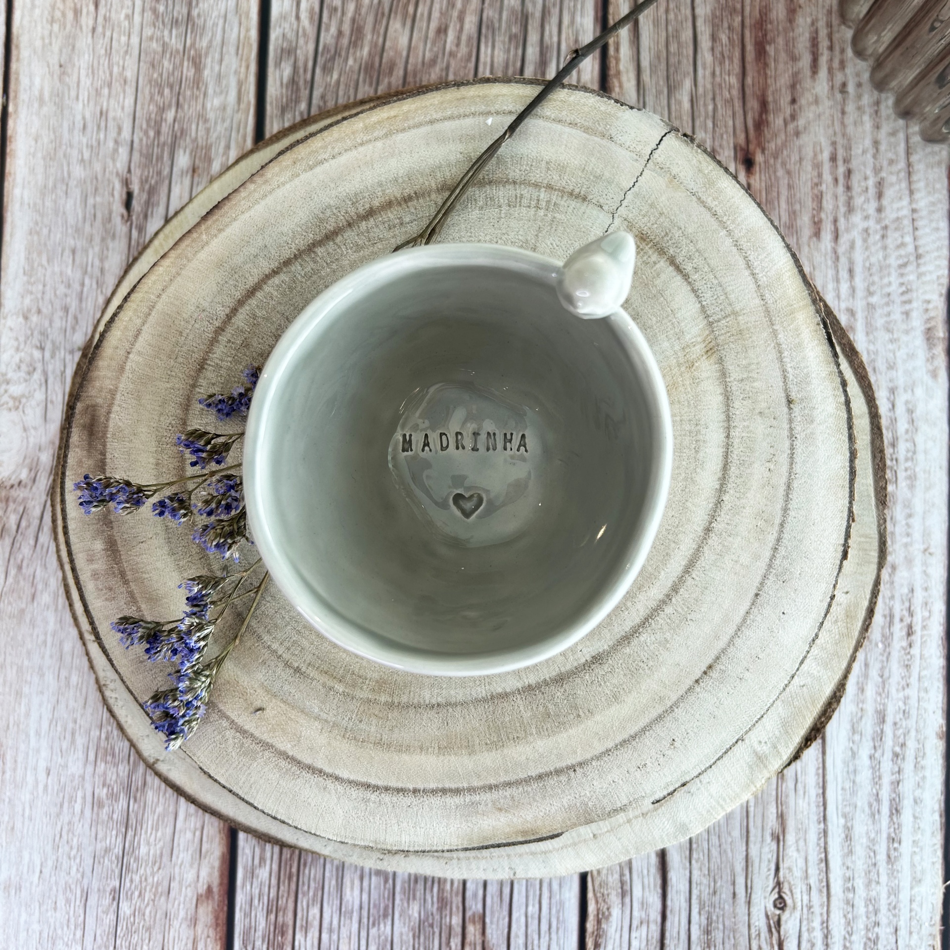 • Xícara de cerâmica cinzenta com colherinha, palavra MADRINHA e coração interior, sobre suporte de madeira e flores secas lilases