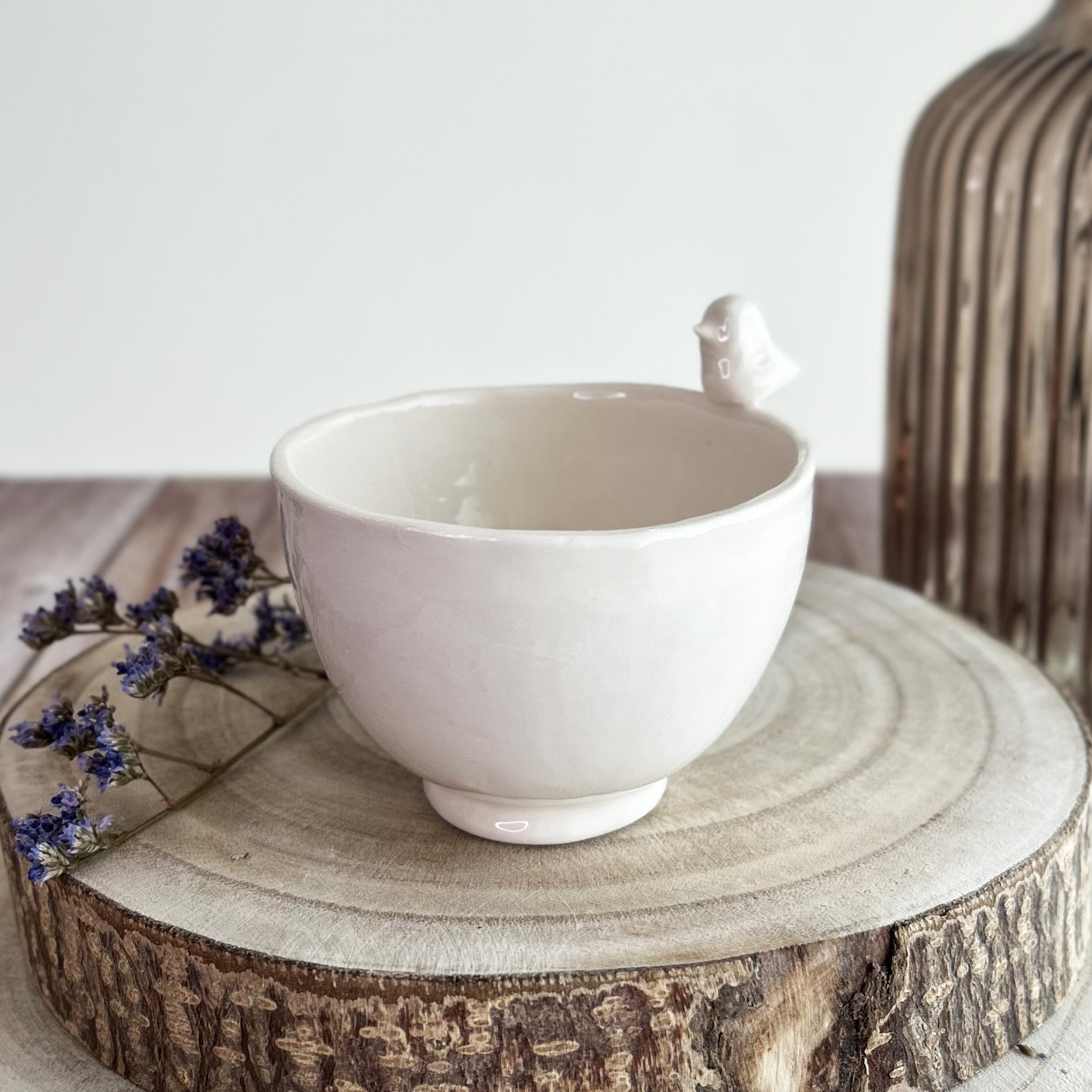 • Chávena cerâmica branca com pássaro decorativo em suporte de madeira com flores e vaso castanho ao fundo
