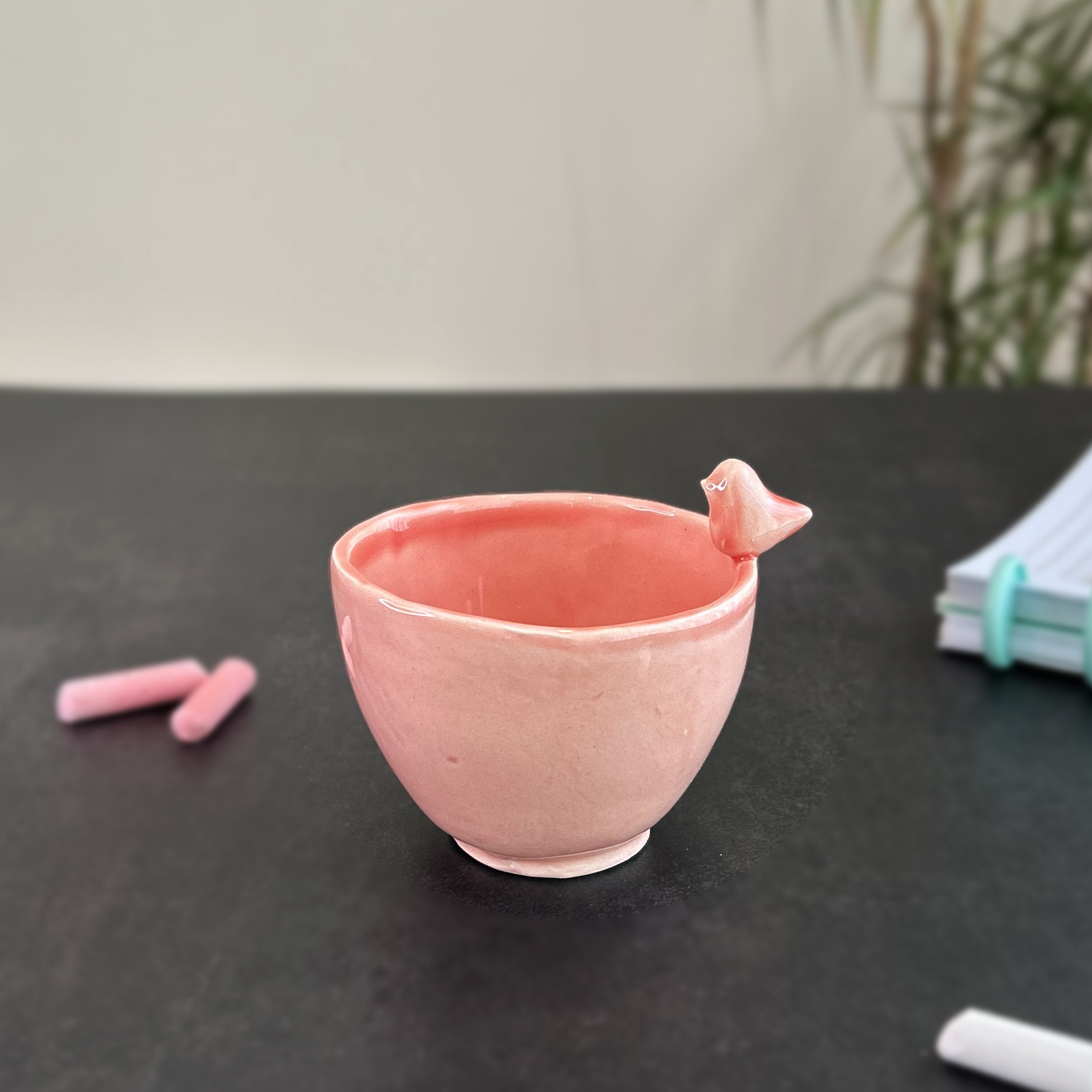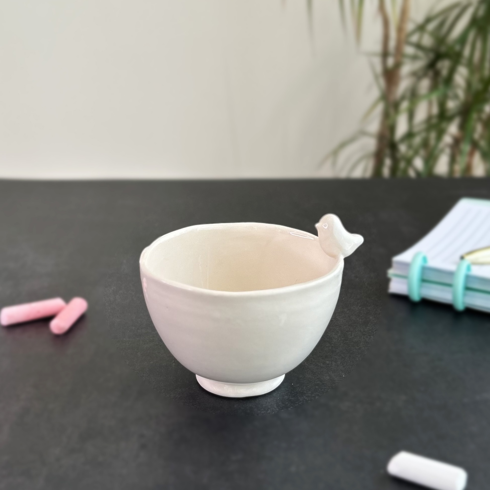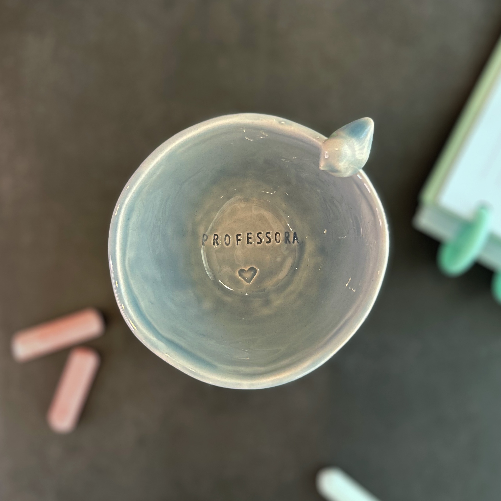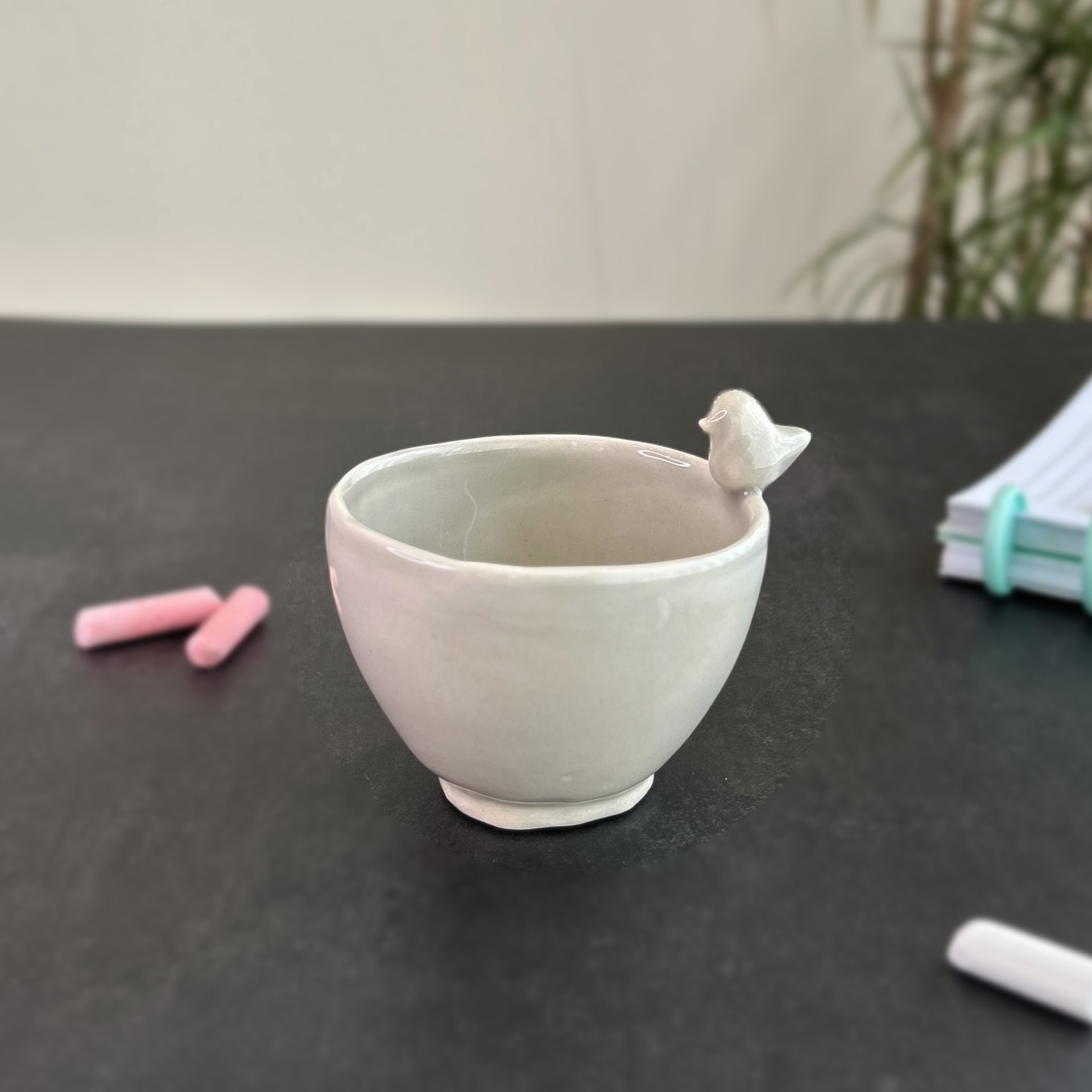 • Cupinha azul claro em cerâmica com pássaro na borda sobre mesa preta com giz e caderno.