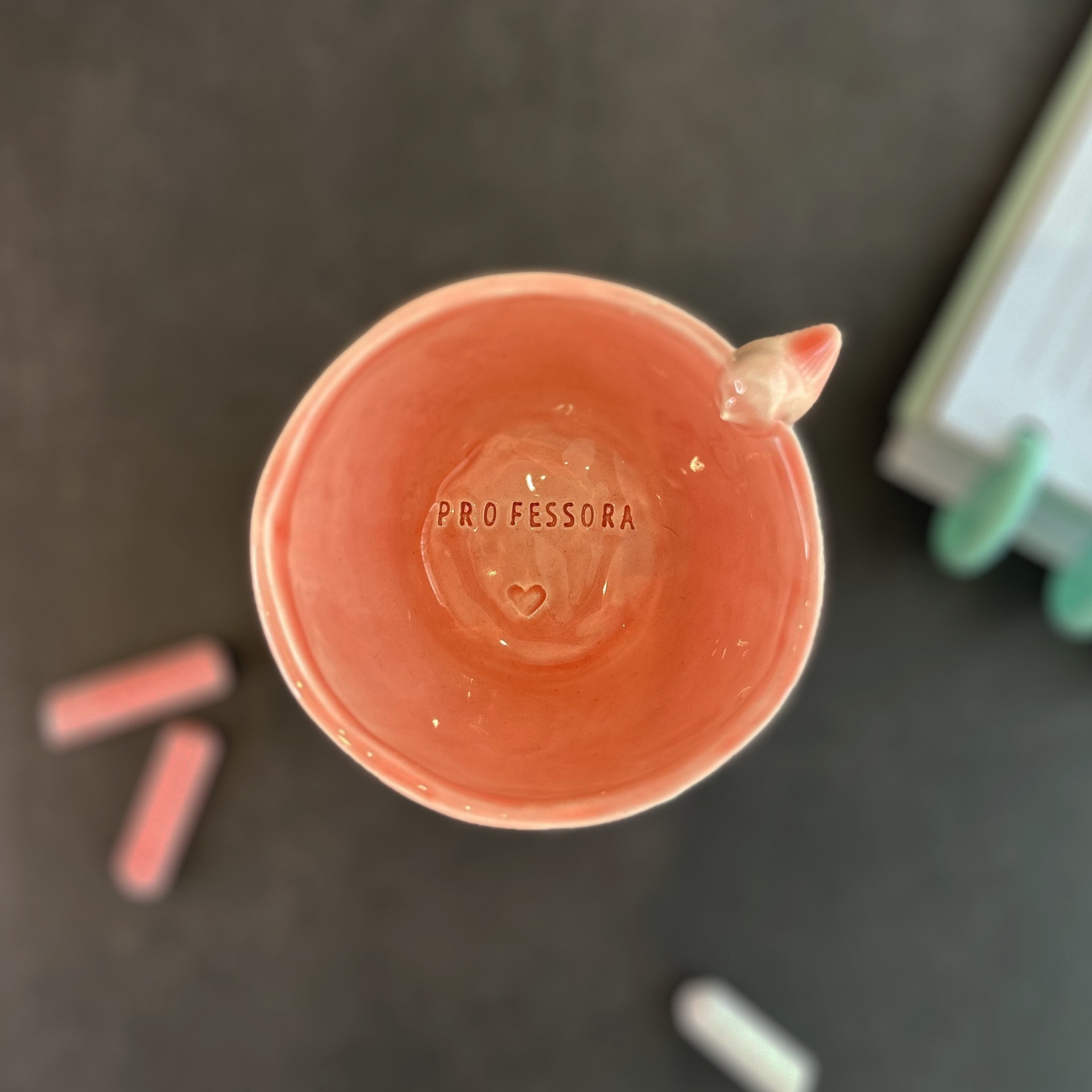 • Taça de cerâmica azul claro com palavra PROFESSORA e coração no interior